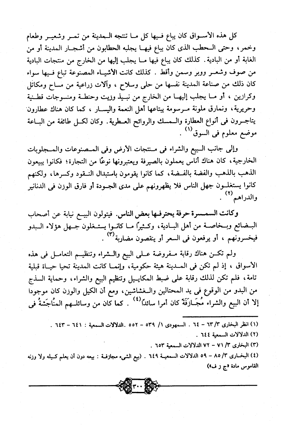 ولم تكن هناك رقابة مفروضة على البيع والشراء وتنظيم التعامل في هذه الأسواق، إذ لم تكن في المدينة هيئة حكومية؛ وإنما كانت المدينة تحيا حياة قبلية تامة؛ فلم تكن لذلك رقابة على ضبط المكاييل وتنظيم البيع والشراء، وحماية السذج من البدو من الوقوع في يد المحتالين والغشاشين ومع أن الكيل والوزن كان موجودًا؛ إلا أن البيع والشراء مجازفة كان أمرًا سائدًا4. كما كان من وسائلهم المناجشة في