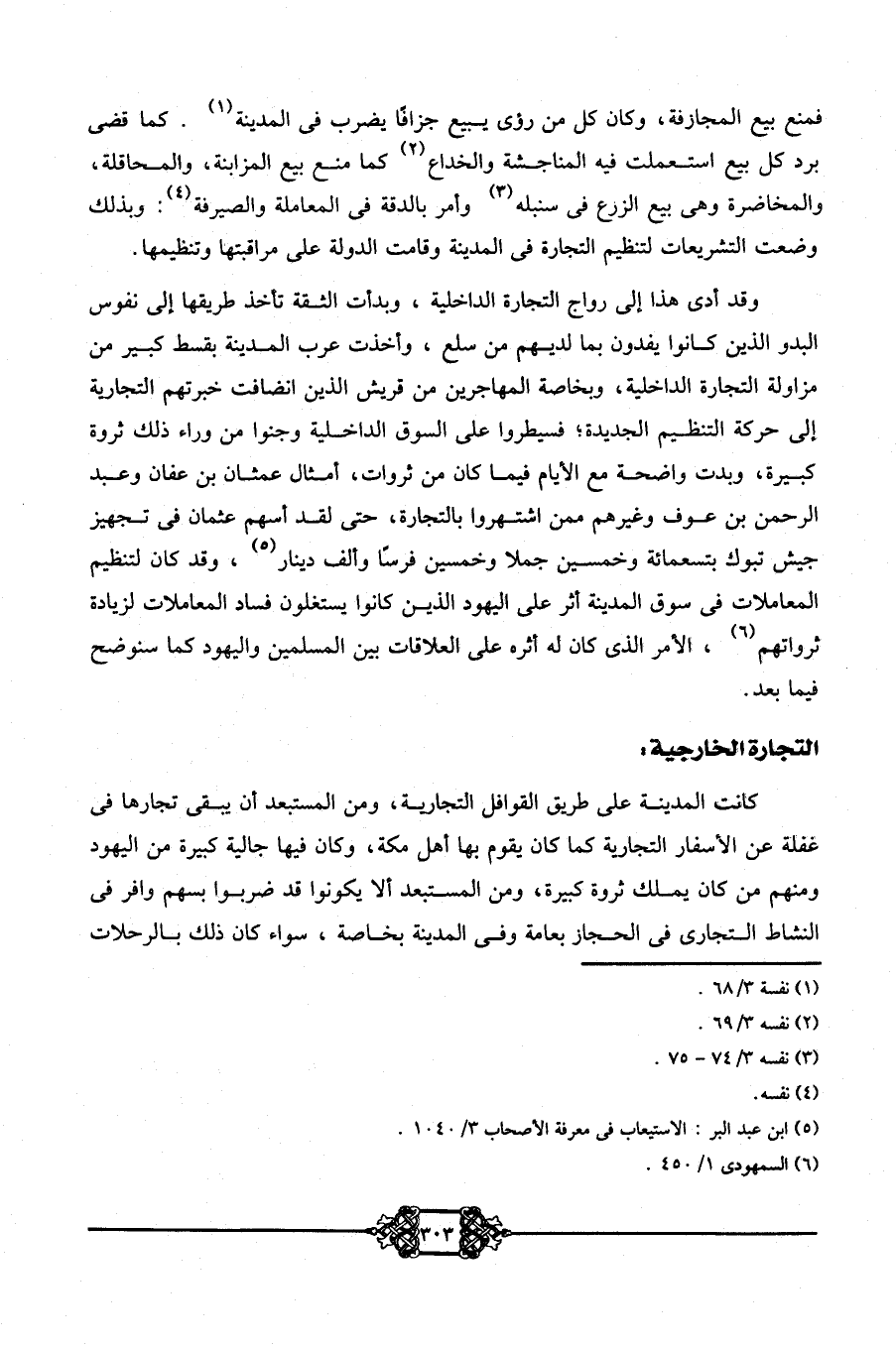 وقد أدى هذا إلى رواج التجارة الداخلية، وبدأت الثقة تأخذ طريقها إلى نفوس البدو الذين كانوا يفدون بما لديهم من سلع، وأخذت عرب المدينة بقسط كبير من مزاولة التجارة الداخلية، وبخاصة المهاجرين من قريش الذين انضافت خبرتهم التجارية إلى حركة التنظيم الجديدة؛ فسيطروا على السوق الداخلية وجنوا من وراء ذلك ثروة كبيرة، وبدت واضحة مع الأيام فيما كان من ثروات، أمثال عثمان بن عفان وعبد الرحمن بن عوف وغيرهم ممن اشتهروا بالتجارة، حتى لقد أسهم عثمان في تجهيز جيش تبوك بتسعمائة وخمسين جملًا وخمسين فرسًا وألف دينار5، وقد كان لتنظيم المعاملات في سوق المدينة أثر على اليهود الذين كانوا يستغلون فساد المعاملات لزيادة ثرواتهم6، الأمر الذي كان له أثره على العلاقات بين المسلمين واليهودكان سنوضح فيما بعد.