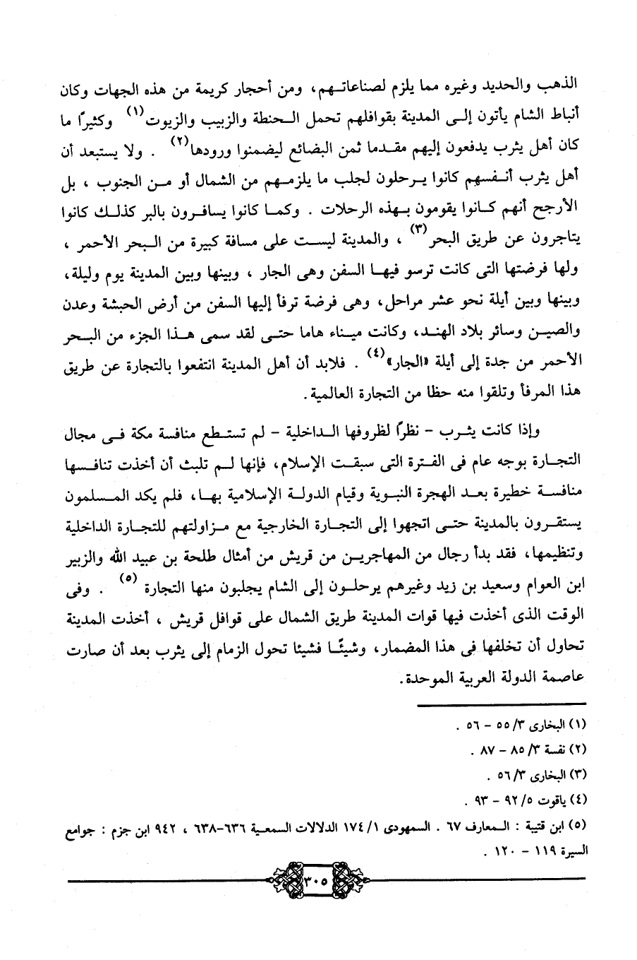 وإذا كانت يثرب -نظرًا لظروفها الداخلية- لم تستطع منافسة مكة في مجال التجارة بوجه عام في الفترة التي سبقت الإسلام؛ فإنها لم تلبث أن أخذت تنافسها منافسة خطيرة بعد الهجرة النبوية وقيام الدولة الإسلامية بها؛ فلم يكد المسلمون يستقرون بالمدينة حتى اتجهوا إلى التجارة الخارجية مع مزاولتهم للتجارة الداخلية وتنظيمها، فقد بدأ رجال من المهاجرين من قريش من أمثال طلحة بن عبيد الله والزبير بن العوام وسعيد بن زيد وغيرهم يرحلون إلى الشام يجلبون منها التجارة5. وفي الوقت الذي أخذت فيها قوات المدينة طريق الشمال على قوافل قريش، أخذت المدينة تحاول أن تخلفها في هذا المضمار، وشيئًا فشيئًا تحول الزمام إلى يثرب بعد أن صارت عاصمة الدولة العربية الموحدة