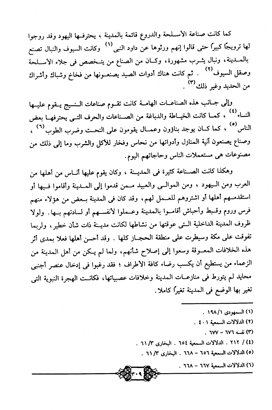 وهكذا كانت الصناعة كثيرة في المدينة، وكان يقوم عليها أناس من أهلها من العرب ومن اليهود، ومن الموالي والعبيد ممن قدموا إلى المدينة وأقاموا فيها أو استقدمهم أهلها أو اشتروهم للعمل لهم، وقد كان في المدينة بعض من هؤلاء منهم فرس وروم وقبط وأحباش أقاموا بالمدينة وعملوا لأنفسهم أو لسادتهم بها. ولولا ظروف المدينة الداخلية التي عوقتها من نشاطها؛ لكانت مدينة ذات شأن خطير، ولربما تفوقت على مكة وسيطرت على منطقة الحجاز كلها. وقد أحسن أهلها فعلًا بمدى أثر هذه الخلافات المعوقة وسعوا إلى إصلاح شأنهم، ولما لم يكن من أهل المدينة من الزعماء من يستطيع أن يكسب رضاء كافة الأطراف؛ فقد رغبوا في إدخال عنصر أجنبي محايد لم يتورط في منازعات المدينة وخلافات عصبياتها، فكانت الهجرة النبوية التي تغير بها الوضع في المدينة تغيرًا كاملًا.