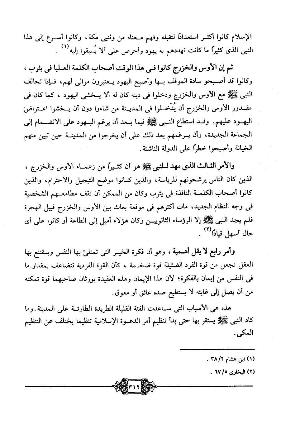 هذه هي الأسباب التي ساعدت الفئة القليلة الطريدة الطارئة على المدينة. وما كاد النبي -صلى الله عليه وسلم- يستقر بها حتى بدأ تنظيم أمر الدعوة الإسلامية تنظيمًا يختلف عن التنظيم المكي.