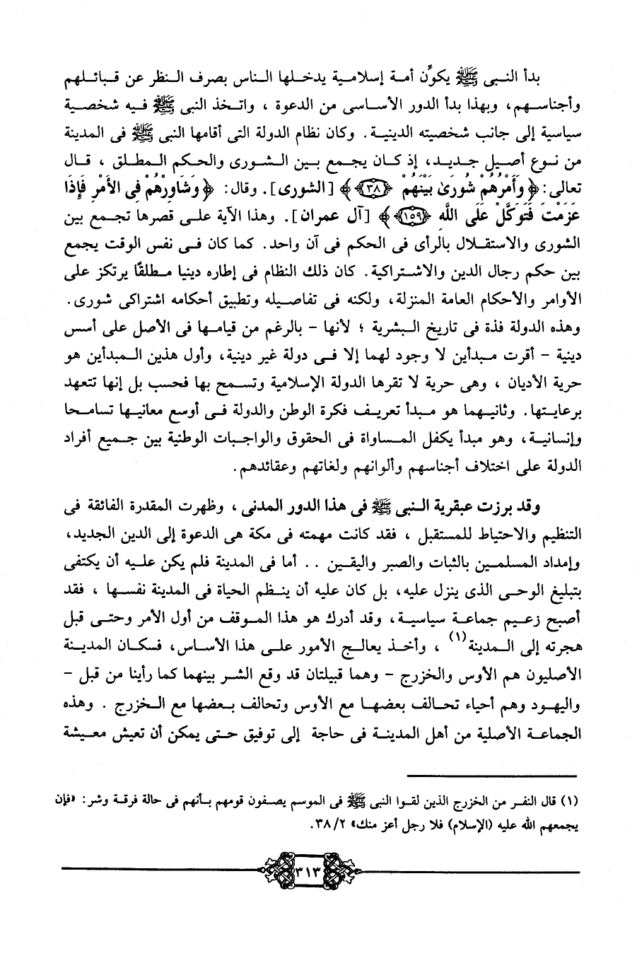 بدأ النبي -صلى الله عليه وسلم- يُكَوِّن أمة إسلامية يدخلها الناس بصرف النظر عن قبائلهم وأجناسهم، وبهذا بدأ الدور الأساسي من الدعوة، واتخذ النبي -صلى الله عليه وسلم- فيه شخصية سياسية إلى جانب شخصيته الدينية. وكان نظام الدولة التي أقامها النبي -صلى الله عليه وسلم- في المدينة من نوع أصيل جديد، إذ كان يجمع بين الشورى والحكم المطلق، قال تعالى: {وَأَمْرُهُمْ شُورَى بَيْنَهُم} [الشورى] . وقال: {وَشَاوِرْهُمْ فِي الأَمْرِ فَإِذَا عَزَمْتَ فَتَوَكَّلْ عَلَى اللَّهِ} [آل عمران] . وهذه الآية على قصرها تجمع بين الشورى والاستقلال بالرأي في الحكم في آنٍ واحد. كما كان في نفس الوقت يجمع بين حكم رجال الدين والاشتراكية. كان ذلك النظام في إطاره دينيًّا مطلقًا يرتكز على الأوامر والأحكام العامة المنَزَّلة، ولكنه في تفاصيله وتطبيق أحكامه اشتراكي شورى. وهذه الدولة فذة في تاريخ البشرية؛ لأنها -بالرغم من قيامها في الأصل على أسس دينية- أقرت مبدأين لا وجود لهما إلا في دولة غير دينية، وأول هذين المبدأين هو: حرية الأديان، وهي حرية لا تقرها الدولة الإسلامية وتسمح بها فحسب؛ بل إنها تتعهد برعايتها. وثانيهما هو: مبدأ تعريف فكرة الوطن والدولة في أوسع معانيها تسامحًا وإنسانية، وهو مبدأ يكفل المساواة في الحقوق والواجبات الوطنية بين جميع أفراد الدولة على اختلاف أجناسهم وألوانهم ولغاتهم وعقائدهم.