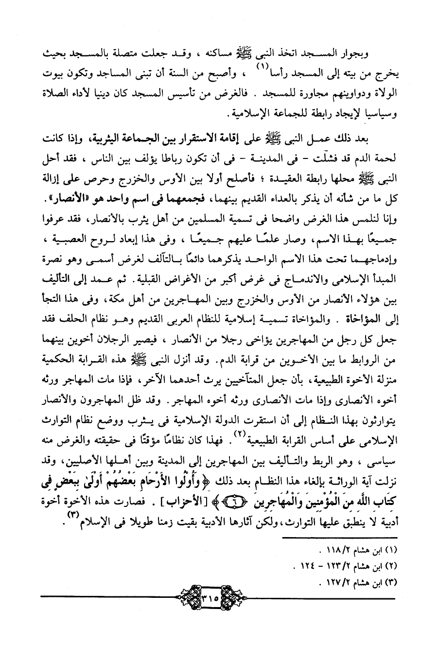 بعد ذلك عمل النبي -صلى الله عليه وسلم- على إقامة الاستقرار بين الجماعة اليثربية، وإذا كانت لُحْمَة الدم قد فشلت -في المدينة- في أن تكون رباطًا يؤلف بين الناس، فقد أحل النبي -صلى الله عليه وسلم- محلها رابطة العقيدة؛ فأصبح أولًا بين الأوس والخزرج وحرص على إزالة كل ما من شأنه أن يذَكِّر بالعداء القديم بينهما، فجمعهما في اسم واحد هو: الأنصار. وإنا لنلمس هذا الغرض واضحًا في تسمية المسلمين من أهل يثرب بالأنصار فقد عرفوا جميعًا بهذا الاسم، وصار علمًا عليهم جميعًا، وفي هذا إبعاد لروح العصبية وإدماجها تحت هذا الاسم الواحد، يذكرهما دائمًا بالتآلُف لغرض أسمى وهو نصرة المبدأ الإسلامي، والاندماج في غرض أكبر من الأغراض القبلية. ثم عمد إلى التأليف بين هؤلاء الأنصار من الأوس والخزرج وبين المهاجرين من أهل مكة، وفي هذا التجأ إلى المؤاخاة. والمؤاخاة تسمية إسلامية للنظام العربي القديم، وهو نظام الحِلْفِ فقد جعل كل رجل من المهاجرين يؤاخي رجلًا من الأنصار، فيصير الرجلان أخوين بينهما من الروابط ما بين الأخوين من قرابة الدم. وقد أنزل النبي -صلى الله عليه وسلم- هذه القرابة الحكمية منزلة الأخوة الطبيعية. بأن جعل المتآخيين يرث أحدهما الآخر، فإذا مات المهاجر ورثه أخوه الأنصاري، وإذا مات الأنصاري ورثه أخوه المهاجر. وقد ظل المهاجرون والأنصار يتوارثون بهذا النظام إلى أن استقرت الدولة الإسلامية في يثرب ووضع نظام التوارث الإسلامي على أساس القرابة الطبيعية2. فهذا كان نظامًا مؤقتًا في حقيقته والغرض منه سياسي، وهو الربط والتأليف بين المهاجرين إلى المدينة وبين أهلها الأصليين، وقد نزلت آية الوراثة بإلغاء هذا النظام بعد ذلك: {وَأُولُوا الأَرْحَامِ بَعْضُهُمْ أَوْلَى بِبَعْضٍ فِي كِتَابِ اللَّهِ مِنَ الْمُؤْمِنِينَ وَالْمُهَاجِرِينَ} [الأحزاب] . فصارت هذه الأخوة أخوة أدبية لا ينطبق عليها التوارث، ولكن آثارها الأدبية بقيت زمنًا طويلًا في الإسلام3.