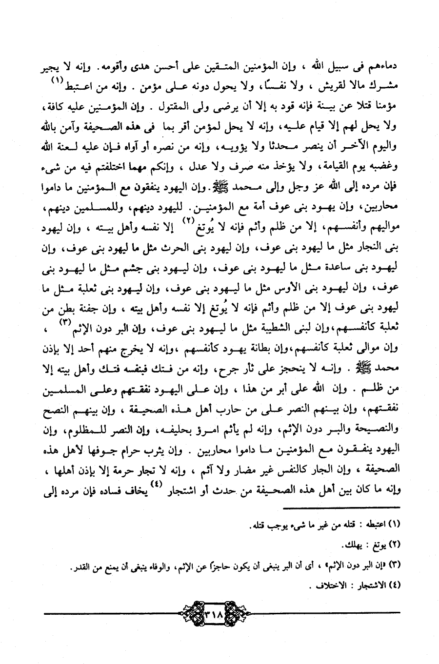 دماءهم في سبيل الله، وإن المؤمنين المتقين على أحسن هدى وأقومه. وإنه لا يجير مشرك مالًا لقريش، ولا نفسًا، ولا يحول دونه على مؤمن. وإنه من اعتبط1 مؤمنًا قتلًا عن بينة فإنه قود به إلا أن يرضى ولي المقتول. وإن المؤمنين عليه كافة ولا يحل لهم إلا قيام عليه، وإنه لا يحل لمؤمن أقر بما في هذه الصحيفة وآمن بالله واليوم الآخر أن ينصر محدثًا ولا يؤويه، وإنه من نصره أو آواه فإن عليه لعنة الله وغضبه يوم القيامة، ولايؤخذ منه صرف ولا عدل، وإنكم مهما اختلفتم فيه من شيء فإن مرده إلى الله عز وجل وإلى محمد -صلى الله عليه وسلم- وإن اليهود ينفقون مع المؤمنين ما داموا محاربين وإن يهود بني عوف أمة مع المؤمنين. لليهود دينهم، وللمسلمين دينهم، مواليهم وأنفسهم، إلا من ظلم وأثم فإنه لا يوتغ2 إلا نفسه وأهل بيته، وإن ليهود بني النجار مثل ما ليهود بني عوف، وإن ليهود بني الحارث مثل ما ليهود بني عوف، وإن ليهود بني ساعدة مثل ما ليهود بني عوف، وإن ليهود بني جشم مثل ما ليهود بني عوف، وإن ليهود بني الأوس مثل ما ليهود بني عوف، وإن ليهود بني ثعلبة مثل ما ليهود بني عوف، إلا من ظلم وأثم فإنه لا يوتغ إلا نفسه وأهل بيته، وإن جفنة بطن من ثعلبة كأنفسهم، وإن لبني الشطيبة مثل ما ليهود بني عوف، وإن البر دون الإثم3، وإن موالي ثعلبة كأنفسهم، وإن بطانة يهود كأنفسهم، وإنه لا يخرج منهم أحد إلا بإذن محمد -صلى الله عليه وسلم- وإنه لا ينحجز على ثأر جرح، وإنه من فتك فبنفسه فتك وأهل بيته إلا من ظلم. وإن الله على أبر من هذا، وإن على اليهود نفقتهم وعلى المسلمين نفقتهم، وإن بينهم النصر على من حارب أهل هذه الصحيفة، وإن بينهم النصح والنصيحة والبر دون الإثم، وإنه لم يأثم امرؤ بحليفه، وإن النصر للمظلوم، وإن اليهود ينفقون مع المؤمنين ما داموا محاربين. وإن يثرب حرام جوفها لأهل هذه الصحيفة، وإن الجار كالنفس غير مضار ولا آثم، وإنه لا تجار حرمة إلا بإذن أهلها، وإنه ما كان بين أهل هذه الصحيفة من حدث أو اشتجار4 يخاف فساده فإن مرده إلى