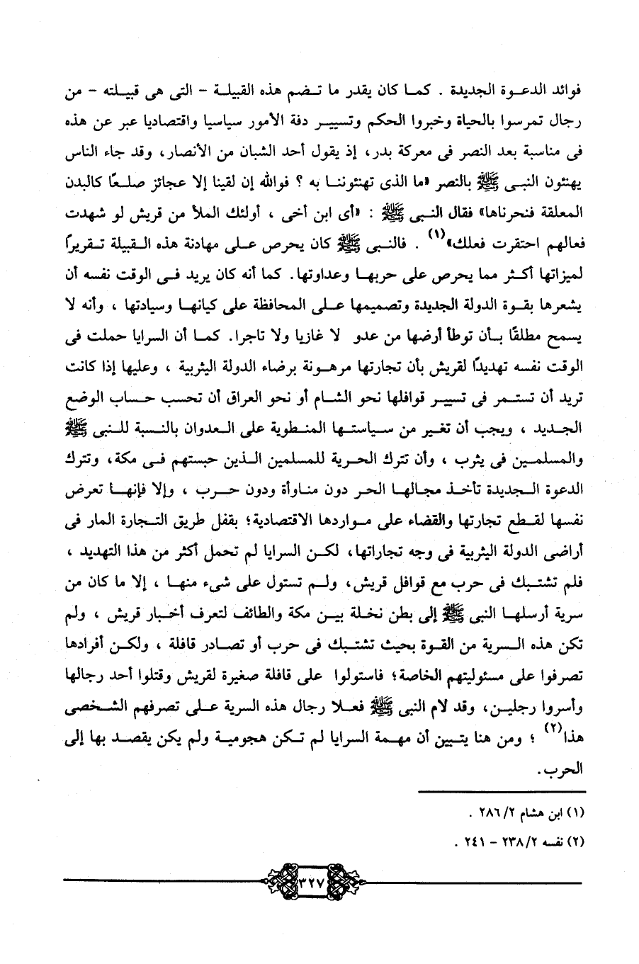 فقال النبي صلى الله عليه وسلم: "أي ابن أخي، أولئك الملأ من قريش لو شهدت فعالهم احتقرت فعلك" 1. فالنبي -صلى الله عليه وسلم- كان يحرص على مهادنة هذه القبيلة تقريرًا لميزاتها أكثر مما يحرص على حربها وعداوتها كما أنه كان يريد في الوقت نفسه أن يشعرها بقوة الدولة الجديدة وتصميمها على المحافظة على كيانها وسيادتها، وأنه لا يسمح مطلقًا بأن توطأ أرضها من عدو لا غازيًا ولا تاجرًا. كما أن السرايا حملت في الوقت نفسه تهديدًا لقريش بأن تجارتها مرهونة برضاء الدولة اليثربية، وعليها إذا كانت تريد أن تستمر في تسيير قوافلها نحو الشام أو نحو العراق أن تحسب حساب الوضع الجديد، ويجب أن تغير من سياستها المنطوية على العدوان بالنسبة للنبي -صلى الله عليه وسلم- والمسلمين في يثرب. وأن تترك الحرية للمسلمين الذين حبستهم في مكة، وتترك الدعوة الجديدة تأخذ مجالها الحر دون مناوأة ودون حرب؛ وإلا فإنها تعرض نفسها لقطع تجارتها والقضاء على مواردها الاقتصادية؛ بقفل طريق التجارة المار في أراضي الدولة اليثربية في وجه تجاراتها، لكن السرايا لم تحمل أكثر من هذا التهديد؛ فلم تشتبك في حرب مع قوافل قريش ولم تستول على شيء منها، إلا ما كان من سرية أرسلها النبي -صلى الله عليه وسلم- إلى بطن نخلة بين مكة والطائف لتعرف أخبار قريش، ولم تكن هذه السرية من القوة بحيث تشتبك في حرب أو تصادر قافلة، ولكن أفرادها تصرفوا على مسئوليتهم الخاصة؛ فاستولوا على قافلة صغيرة لقريش وقتلوا أحد رجالها وأسروا رجلين، وقد لام النبي -صلى الله عليه وسلم- بالفعل رجال هذه السرية على تصرفهم الشخصي هذا2، ومن هنا يتبين أن مهمة السرايا لم تكن هجومية ولم يكن يقصد بها إلى