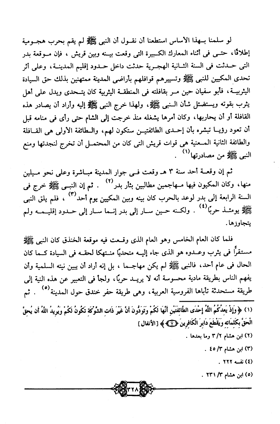 لو سلمنا بهذا الأساس استطعنا أن نقول: أن النبي -صلى الله عليه وسلم- لم يقم بحرب هجومية إطلاقًا، حتى في أثناء المعارك الكبيرة التي وقعت بينه وبين قريش؛ فإن موقعة بدر التي حدثت في السنة الثانية الهجرية حدثت داخل حدود إقليم المدينة، وعلى أثر تحدي المكيين للنبي -صلى الله عليه وسلم- وتسييرهم قوافلهم بأراضي المدينة ممتهنين بذلك حق السيادة اليثربية، فأبو سفيان حين مر بقافلته في المنطقة اليثربية كان يتحدى ويدل على أهل يثرب بقوته ويستضئل شأن النبي -صلى الله عليه وسلم- ولهذا خرج النبي -صلى الله عليه وسلم- إليه وأراد أن يصادر هذه القافلة أو أن يحاربها، وكان أمرها يشغله منذ خرجت إلى الشام حتى رأى في منامه قبل أن تعود رؤيا تبشره بأن إحدى الطائفتين ستكون لهم، والطائفة الأولى هي القافلة والطائفة الثانية المعنية هي قوات قريش التي كان من المحتمل أن تخرج لنجدتها، ومنع النبي -صلى الله عليه وسلم- من مصادرتها1.