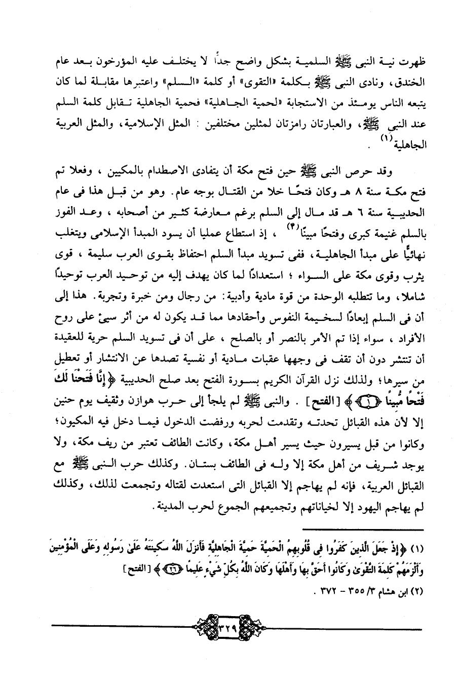 وقد حرص النبي -صلى الله عليه وسلم- حين فتح مكة أن يتفادى الاصطدام بالمكيين. وفعلًا تم فتح مكة سنة 8هـ، وكان فتحًا خلا من القتال بوجه عام. وهو من قبل هذا في عام الحديبية سنة 6هـ، قد مال إلى السلم برغم معارضة كثير من أصحابه، وعد الفوز بالسلم غنيمة كبرى وفتحًا مبينًا2، إذ استطاع عمليًّا أن يسود المبدأ الإسلامي ويتغلب نهائيًّا على مبدأ الجاهلية؛ ففي تسويد مبدأ السلم احتفاظ بقوى العرب سليمة، قوى يثرب وقوى مكة على السواء؛ استعدادًا لما كان يهدف إليه من توحيد العرب توحيدًا شاملًا، وما تتطلبه الوحدة من قوة مادية وأدبية: من رجال ومن خبرة وتجربة. هذا إلى أن في السلم إبعادًا لسخيمة النفوس وأحقادها مما قد يكون له من أثر سيئ على روح الأفراد، سواء إذا تم الأمر بالنصر أو بالصلح، على أن في تسويد السلم حرية للعقيدة أن تنتشر دون أن تقف في وجهها عقبات مادية أو نفسية تصدها عن الانتشار أو تعطيل من سيرها؛ ولذلك نزل القرآن الكريم بسورة الفتح بعد صلح الحديبية {إِنَّا فَتَحْنَا لَكَ فَتْحًا مُبِينًا} [الفتح] . والنبي - صلى الله عليه وسلم- لم يلجأ إلى حرب هوازن وثقيف يوم حنين إلا لأن هذه القبائل تحدته وتقدمت لحربه ورفضت الدخول فيما دخل فيه المكيون؛ وكانوا من قبل يسيرون حيث يسير أهل مكة، وكانت الطائف تعتبر من ريف مكة، ولا يوجد شريف من أهل مكة إلا وله في الطائف بستان. وكذلك حرب النبي -صلى الله عليه وسلم- مع القبائل العربية؛ فإنه لم يهاجم إلا القبائل التي استعدت لقتاله وتجمعت لذلك، وكذلك لم يهاجم اليهود إلا لخياناتهم وتجميعهم الجموع لحرب المدينة.