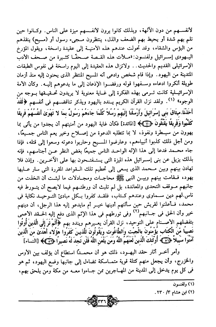 لأنفسهم من دون الآلهة، وبذلك كانوا يرون لأنفسهم ميزة على الناس. وكانوا حين تلم بهم شدة أو يحيط بهم الضعف والذل ينتظرون مجيء رسول أو مسيح ينقذهم من البؤس والشقاء، وقد تحولت عندهم هذه الأمنية إلى عقيدة راسخة، ويقول المؤرخ اليهودي إسرائيل ولفنسون: ملأت هذه القصة صحفًا كثيرة من صحف الأدب الإسرائيلي القديم والحديث. ولا تزال هذه العقيدة إلى اليوم راسخة في نفوس الطبقات المتدينة من اليهود. وإذا قام شخص وادعى أنه المسيح المنتظر الذي يحنون إليه منذ أزمان طويلة أنكروا ادعاءه وسفهوا قوله ورفضوا الإذعان إلى ما يدعوهم إليه. وكأن الأمة الإسرائيلية كانت ترمي بهذه الفكرة إلى غاية معنوية لا يريدون تحقيقها بوجه من الوجوه 1. ولقد نزل القرآن الكريم يندد باليهود ويذكر تناقضهم في أنفسهم {لَقَدْ أَخَذْنَا مِيثَاقَ بَنِي إِسْرَائِيلَ وَأَرْسَلْنَا إِلَيْهِمْ رُسُلًا كُلَّمَا جَاءَهُمْ رَسُولٌ بِمَا لا تَهْوَى أَنفُسُهُمْ فَرِيقًا كَذَّبُوا وَفَرِيقًا يَقْتُلُونَ} [المائدة] فكأن غاية اليهود من أمنيتهم أن يجدوا من يأتي بما يهوون من سيطرة ونفوذ، لا بما تتطلبه الدعوة من إصلاح وخير يعم الناس جميعًا، ومن أجل ذلك كذبوا أنبياءهم، وعارضوا المسيح وحاربوا دعوته وسعوا إلى قتله؛ فإذا جاء محمد فدعا إلى هذا الإله الواحد الناسَ جميعًا بغض النظر عن أجناسهم، فإنه بذلك يزيل عن بني إسرائيل هذه الميزة التي يستفتحون بها على الآخرين. وإذن فلا تهادن بينهم وبين محمد الذي يسعى إلى تحطيم تلك القواعد المقررة التي سار عليها يهود، فقامت بينهم وبين النبي -صلى الله عليه وسلم- محاجات ومجادلات ما لبثت أن اتخذت من جانبهم موقف التحدي والمعاندة، بل لم تلبث أن ورطتهم فيما لا يصح أن يتورط فيه ناس لهم دين سماوي وعندهم كتاب؛ فلقد كفروا بكل مبادئ التوحيد نكاية في محمد، فأعلنوا لقريش حين سألتهم أدينها خير أم ما يدعو إليه هذا الرجل؟ أن دينهم خير وأن الحق في جانبهم2 وفي تورطهم في هذا الإثم الذي دفع إليه الحقد الأعمى بتفضلهم الأصنام على التوحيد، نزل القرآن يعيرهم ويندد بهم {أَلَمْ تَرَ إِلَى الَّذِينَ أُوتُوا نَصِيبًا مِنَ الْكِتَابِ يُؤْمِنُونَ بِالْجِبْتِ وَالطَّاغُوتِ وَيَقُولُونَ لِلَّذِينَ كَفَرُوا هَؤُلاءِ أَهْدَى مِنَ الَّذِينَ آمَنُوا سَبِيلًا، أُوْلَئِكَ الَّذِينَ لَعَنَهُمُ اللَّهُ وَمَنْ يَلْعَنِ اللَّهُ فَلَنْ تَجِدَ لَهُ نَصِيرًا} [النساء] .