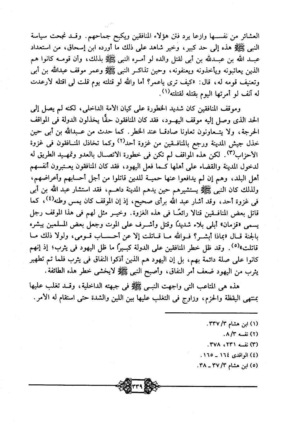 العشائر من نفسها وازعًا يرد فتن هؤلاء المنافقين ويكبح جماحهم. وقد نجحت سياسة النبي -صلى الله عليه وسلم- هذه إلى حد كبير، وخير شاهد على ذلك ما أورده ابن إسحاق من استعداد عبد الله بن عبد الله بن أبي لقتل والده لو أمره النبي - صلى الله عليه وسلم- بذلك، وأن قومه كانوا هم الذين يعاتبونه ويأخذونه ويعنفونه، وحين تذاكر النبي -صلى الله عليه وسلم- وعمر موقف عبد الله بن أبي وتعنيف قومه له قال: "كيف ترى يا عمر؟ أما والله لو قتلته يوم قلت لي اقتله لأرعدت له آنف لو أمرتها اليوم بقتله لقتلته"1.