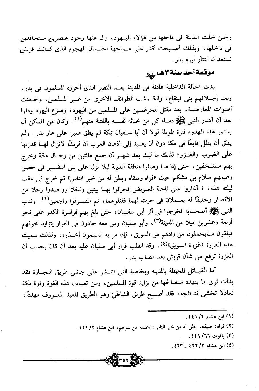 بدت الحالة الداخلية هادئة في المدينة بعد النصر الذي أحرزه المسلمون في بدر، وبعد إجلائهم بني قينقاع، وانكمشت الطوائف الأخرى من غير المسلمين، وخفتت أصوات المعارضة، بعد مقتل المحرضين على المسلمين من اليهود، وفزع اليهود وذلوا بعد أن أهدر النبي -صلى الله عليه وسلم- دماء كل من تحدثه نفسه بالفتنة منهم1. وكان من الممكن أن يستمر هذا الهدوء فترة طويلة لولا أن أبا سفيان بمكة لم يطق صبرًا على عار بدر. ولم يطق أن يظل قابعًا في مكة دون أن يعيد إلى أذهان العرب أن قريشًا لا تزال لها قدرتها على الضرب والغزو؛ لذلك ما لبث بعد شهر أن جمع مائتين من رجال مكة وخرج بهم مستخفين، حتى إذا ما وصلوا منطقة المدينة ليلًا نزل على بني النضير في حصن زعيمهم سلام بن مشكم حيث قراه وسقاه وبطن له من خبر الناس ثم خرج في عقب ليلته هذه، فأغاروا على ناحية العريض فحرقوا بها بيتين ونخلًا ووجدوا رجلًا من الأنصار وحليفًا له يعملان في حرث لهما فقتلوهما، ثم انصرفوا راجعين2. وندب النبي -صلى الله عليه وسلم- أصحابه فخرجوا في أثر أبي سفيان حتى بلغ قرقرة الكدر على نحو أربعة وعشرين ميلًا من المدينة 3، وأبو سفيان ومن معه جادون في الفرار يتزايد خوفهم فيلقون ما يحملون من زادهم من السويق، فإذا مر به المسلمون أخذوه، ولذلك سميت هذه الغزوة غزوة السويق4، وقد انقلب فرار أبي سفيان عليه بعد أن كان يحسب أن الغزوة ترفع من شأن قريش بعد مصاب بدر.