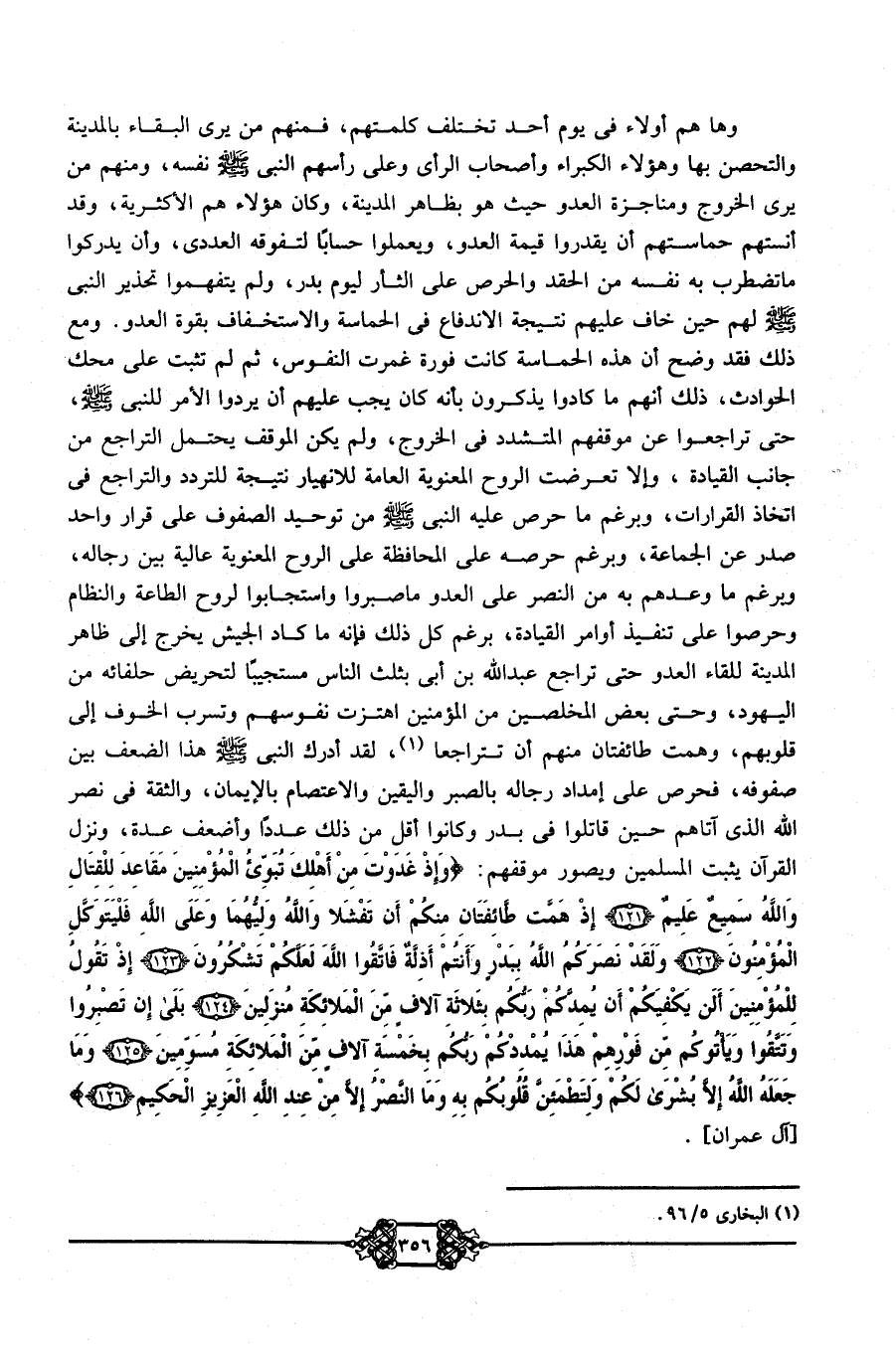 وها هم أولاء في يوم أحد تختلف كلمتهم، فمنهم من يرى البقاء بالمدينة والتحصن بها وهؤلاء الكبراء وأصحاب الرأي وعلى رأسهم النبي -صلى الله عليه وسلم- نفسه، ومنهم من يرى الخروج ومناجزة العدو حيث هو بظاهر المدينة، وكان هؤلاء هم الأكثرية، وقد أنستهم حماستهم أن يقدروا قيمة العدو، ويعملوا حسابًا لتفوقه العددي، وأن يدركوا ما تضطرب به نفسه من الحقد والحرص على الثأر ليوم بدر، ولم يتفهموا تحذير النبي -صلى الله عليه وسلم- لهم حين خاف عليهم نتيجة الاندفاع في الحماسة والاستخفاف بقوة العدو. ومع ذلك فقد وضح أن هذه الحماسة كانت فورة غمرت النفوس، ثم لم تثبت على محك الحوادث، ذلك أنهم ما كادوا يذكرون بأنه كان يجب عليهم أن يردوا الأمر للنبي -صلى الله عليه وسلم- حتى تراجعوا عن موقفهم المتشدد في الخروج، ولم يكن الموقف يحتمل التراجع من جانب القيادة؛ وإلا تعرضت الروح المعنوية العامة للانهيار نتيجة للتردد والتراجع في اتخاذ القرارات، وبرغم ما حرص عليه النبي -صلى الله عليه وسلم- من توحيد الصفوف على قرار واحد صدر عن الجماعة، وبرغم حرصه على المحافظة على الروح المعنوية عالية بين رجاله، وبرغم ما وعدهم به من النصر على العدو ما صبروا واستجابوا لروح الطاعة والنظام وحرصوا على تنفيذ أوامر القيادة، برغم كل ذلك؛ فإنه ما كاد الجيش يخرج إلى ظاهر المدينة للقاء العدو حتى تراجع عبد الله بن أبي بثلث الناس مستجيبًا لتحريض حلفائه من اليهود، وحتى بعض المخلصين من المؤمنين اهتزت نفوسهم وتسرب الخوف إلى قلوبهم، وهمت طائفتان منهم أن تتراجعا1، لقد أدرك النبي -صلى الله عليه وسلم- هذا الضعف بين صفوفه فحرص على إمداد رجاله بالصبر واليقين والاعتصام بالإيمان، والثقة في نصر الله الذي آتاهم حين قاتلوا في بدر وكانوا أقل من ذلك عددًا وأضعف عدة، ونزل القرآن يثبت المسلمين ويصور موقفهم: {وَإِذْ غَدَوْتَ مِنْ أَهْلِكَ تُبَوِّئُ الْمُؤْمِنِينَ مَقَاعِدَ لِلْقِتَالِ وَاللَّهُ سَمِيعٌ عَلِيمٌ، إِذْ هَمَّتْ طَائِفَتَانِ مِنْكُمْ أَنْ تَفْشَلا وَاللَّهُ وَلِيُّهُمَا وَعَلَى اللَّهِ فَلْيَتَوَكَّلِ الْمُؤْمِنُونَ، وَلَقَدْ نَصَرَكُمُ اللَّهُ بِبَدْرٍ وَأَنْتُمْ أَذِلَّةٌ فَاتَّقُوا اللَّهَ لَعَلَّكُمْ تَشْكُرُونَ، إِذْ تَقُولُ لِلْمُؤْمِنِينَ أَلَنْ يَكْفِيَكُمْ أَنْ يُمِدَّكُمْ رَبُّكُمْ بِثَلاثَةِ آلافٍ مِنَ الْمَلائِكَةِ مُنْزَلِينَ، بَلَى إِنْ تَصْبِرُوا وَتَتَّقُوا وَيَأْتُوكُمْ مِنْ فَوْرِهِمْ هَذَا يُمْدِدْكُمْ رَبُّكُمْ بِخَمْسَةِ آلافٍ مِنَ الْمَلائِكَةِ مُسَوِّمِينَ، وَمَا جَعَلَهُ اللَّهُ إِلاَّ بُشْرَى لَكُمْ وَلِتَطْمَئِنَّ قُلُوبُكُمْ بِهِ وَمَا النَّصْرُ إِلاَّ مِنْ عِنْدِ اللَّهِ الْعَزِيزِ الْحَكِيمِ} [آل عمران] .