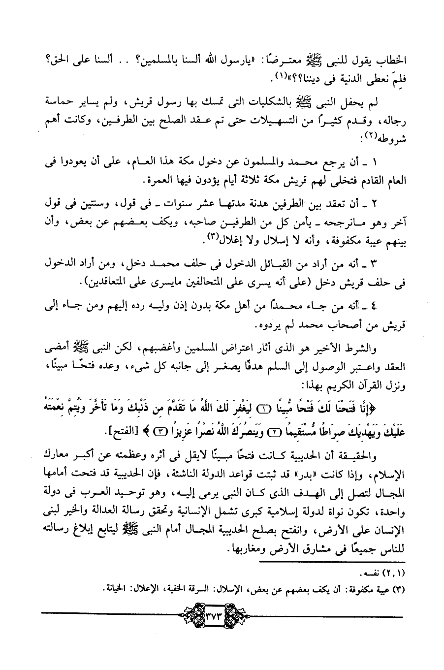 والشرط الأخير هو الذي أثار اعتراض المسلمين وأغضبهم، لكن النبي -صلى الله عليه وسلم- أمضى العقد واعتبر الوصول إلى السلم هدفًا يصغر إلى جانبه كل شيء، وعدَّه فتحًا مبينًا، ونزل القرآن الكريم بهذا: {إِنَّا فَتَحْنَا لَكَ فَتْحًا مُبِينًا، لِيَغْفِرَ لَكَ اللَّهُ مَا تَقَدَّمَ مِنْ ذَنْبِكَ وَمَا تَأَخَّرَ وَيُتِمَّ نِعْمَتَهُ عَلَيْكَ وَيَهْدِيَكَ صِرَاطًا مُسْتَقِيمًا، وَيَنْصُرَكَ اللَّهُ نَصْرًا عَزِيزًا} [الفتح] .