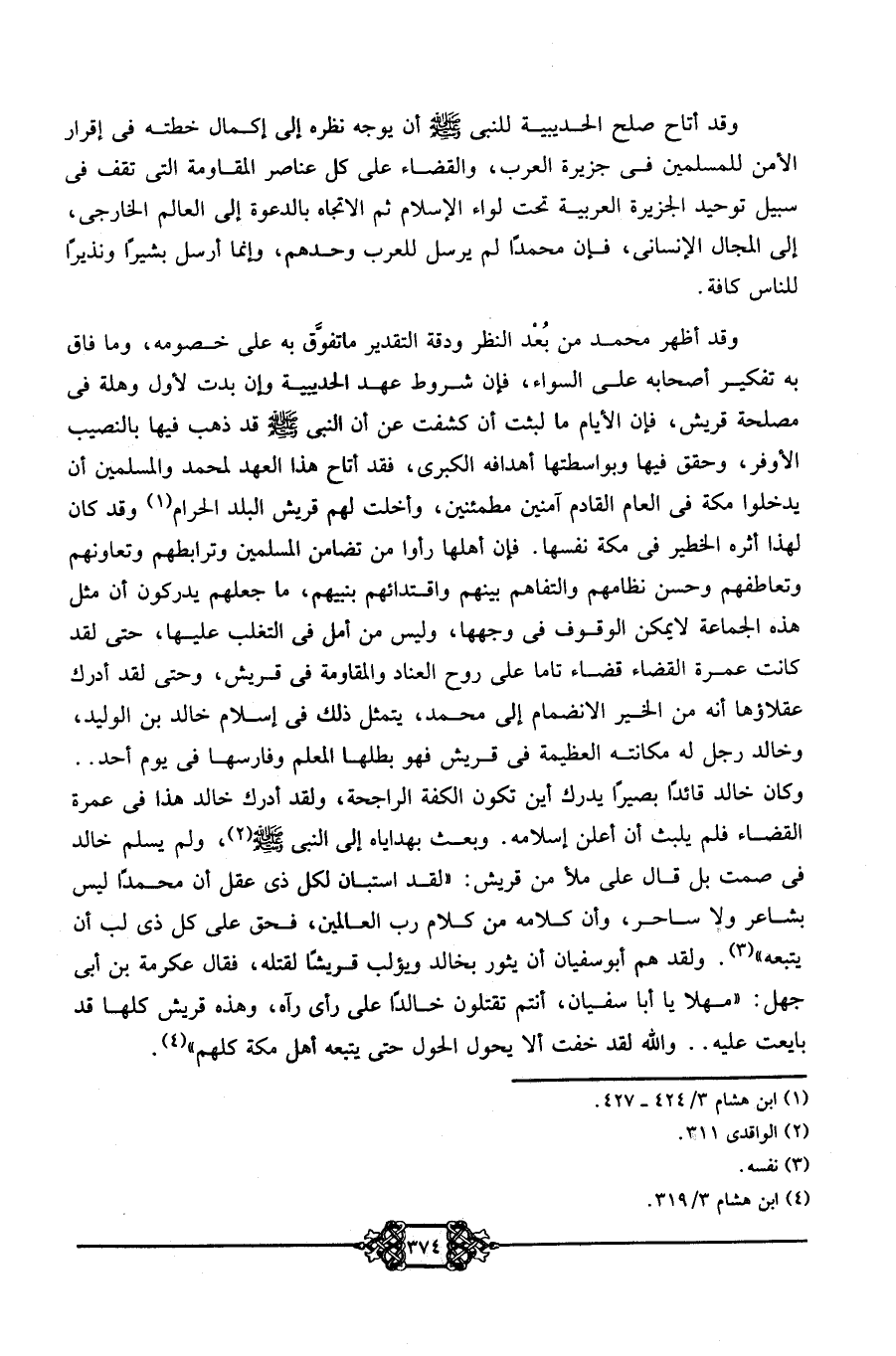 وقد أظهر محمد من بُعد النظر ودقة التقدير ما تفوَّق به على خصومه، وما فاق به تفكير أصحابه على السواء، فإن شروط عهد الحديبية وإن بدت لأول وهلة في مصلحة قريش، فإن الأيام ما لبثت أن كشفت عن أن النبي -صلى الله عليه وسلم- قد ذهب فيها بالنصيب الأوفر، وحقق فيها وبواسطتها أهدافه الكبرى، فقد أتاح هذا العهد لمحمد والمسلمين أن يدخلوا مكة في العام القادم آمنين مطمئنين، وأخلت لهم قريش البلد الحرام1، وقد كان لهذا أثره الخطير في مكة نفسها. فإن أهلها رأوا من تضامن المسلمين وترابطهم وتعاونهم وتعاطفهم وحسن نظامهم والتفاهم بينهم واقتدائهم بنبيهم، ما جعلهم يدركون أن مثل هذه الجماعة لا يمكن الوقوف في وجهها، وليس من أمل في التغلب عليها، حتى لقد كانت عمرة القضاء قضاء تامًّا على روح العناد والمقاومة في قريش، وحتى لقد أدرك عقلاؤها أنه من الخير الانضمام إلى محمد، يتمثل ذلك في إسلام خالد بن الوليد، وخالد رجل له مكانته العظيمة في قريش فهو بطلها المعلم وفارسها في يوم أحد. وكان خالد قائدًا بصيرًا يدرك أين تكون الكفة الراجحة، ولقد أدرك خالد هذا في عمرة القضاء فلم يلبث أن أعلن إسلامه. وبعث بهداياه إلى النبي -صلى الله عليه وسلم-2 ولم يسلم خالد في صمت بل قال على ملأ من قريش: "لقد استبان لكل ذي عقل أن محمدًا ليس بشاعر ولا ساحر، وأن كلامه من كلام رب العالمين، فحق على كل ذي لب أن يتبعه3. ولقد هم أبو سفيان أن يثور بخالد ويؤلب قريشًا لقتله، فقال عكرمة بن أبي جهل: "مهلًا يا أبا سفيان، أنتم تقتلون خالدًا على رأي رآه، وهذه قريش كلها قد بايعت عليه. والله لقد خفت ألا يحول الحول حتى يتبعه أهل مكة كلهم4.