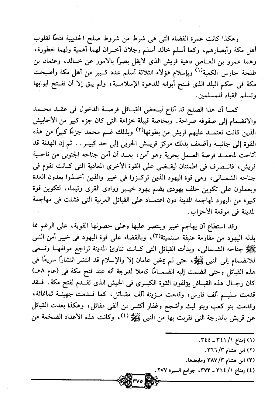 وهكذا كانت عمرة القضاء التي هي شرط من شروط صلح الحديبية فتحًا لقلوب أهل مكة وأبصارهم، وكما أسلم خالد أسلم رجلان آخران لهما أهمية ولهما خطورة وهما: عمرو بن العاص داهية قريش الذي لا يقل بصرًا بالأمور عن خالد، وعثمان بن طلحة حارس الكعبة1، وبإسلام هؤلاء الثلاثة أسلم عدد كبير من أهل مكة وأصبحت مكة في حكم البلد الذي فتح أبوابه للدعوة الإسلامية، ولم يبق إلا أن تفتح أبوابها وتسلم القيادة للمسلمين.