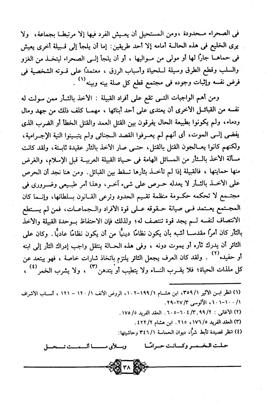 ومن أهم الواجبات التي تقع على أفراد القبيلة: الأخذ بالثأر ممن سولت له نفسه من القبائل الأخرى أن يعتدي على أحد أبنائها، مهما كلف ذلك من جهد ومال ودماء، ولم يكونوا بطبيعة الحال يفرقون بين القتل العمد والقتل الخطأ أو الضرب الذي يفضي إلى الموت، أي أنهم لم يعرفوا القصد الجنائي ولم يتبينوا النية الإجرامية، ولكنهم كانوا يعالجون القتل بالقتل، حتى صار الأخذ بالثأر عقيدة ثابتة، ولقد كانت مسألة الأخذ بالثأر من المسائل الهامة في حياة القبيلة العربية قبل الإسلام، والغرض منها حمياتها، فالقبيلة إذالم تأخذ بثأرها تسقط بين القبائل. ومن هنا نجد أن الحرص على الأخذ بالثأر لا يعدله حرص على شيء آخر، وهذا أمر طبيعي وضروري في مجتمع لا تحكمه حكومة منظمة تقيم الحدود وترعى القانون بسلطانها؛ وإنما كان المجتمع يعتمد في صيانة حقوقه على قوة الأفراد والجماعات، فمن لم يستطيع الانتصاف لنفسه؛ لم يجد قوة تنتصف له؛ ولذلك فإن الاحتفاظ بوحدة القبيلة والأخذ بالثأر كان أمرًا مقدسًا أشبه بأن يكون نظامًا دينيًّا من أن يكون نظامًا عاديًّا. وكان على الثائر أن يدرك ثأره أو يموت دونه، وفي هذه الحالة ينتقل واجب إدراك الثأر إلى ابنه أو حفيده2. ولقد كان العرف يجعل الثائر يلتزم باتخاذ شارات خاصة؛ فهو يبتعد عن كل ملذات الحياة؛ فلا يقرب النساء ولا يتطيب أو يتدهن3، ولا يشرب الخمر4،