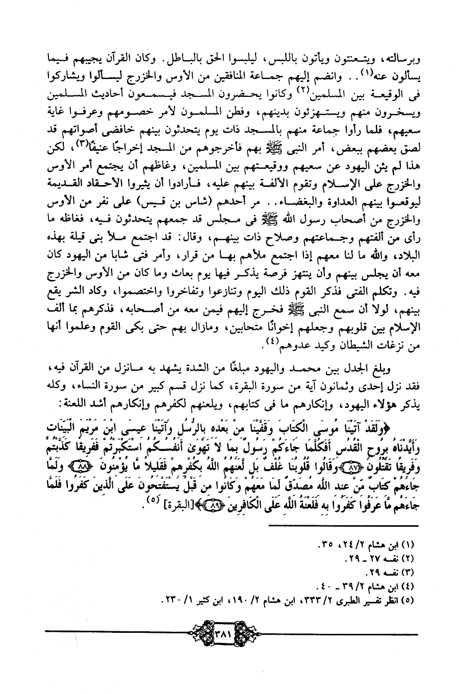 وبرسالته، ويتعنتون ويأتون باللبس، ليلبسوا الحق بالباطل وكان القرآن يجيبهم فيما يسألون عنه1. وانضم إليهم جماعة المنافقين من الأوس والخزرج ليسألوا ويشاركوا في الوقيعة بين المسلمين2 وكانوا يحضرون المسجد فيسمعون أحاديث المسلمين ويسخرون منهم ويستهزئون بدينهم، وفطن المسلمون لأمر خصومهم وعرفوا غاية سعيهم؛ فلما رأوا جماعة منهم بالمسجد ذات يوم يتحدثون بينهم خافضي أصواتهم قد لصق بعضهم ببعض، أمر النبي -صلى الله عليه وسلم- بهم فأخرجوهم من المسجد إخراجًا عنيفًا3؛ لكن هذا لم يثن اليهود عن سعيهم ووقيعتهم بين المسلمين، وغاظهم أن يجتمع أمر الأوس والخزرج على الإسلام وتقوم الألفة بينهم عليه، فأرادوا أن يثيروا الأحقاد القديمة ليوقعوا بينهم العداوة والبغضاء. مر أحدهم -شاس بن قيس- على نفر من الأوس والخزرج من أصحاب رسول الله -صلى الله عليه وسلم- في مجلس قد جمعهم يتحدثون فيه، فغاظه ما رأى من ألفتهم وجماعتهم وصلاح ذات بينهم، وقال: قد اجتمع ملأ بني قيلة بهذه البلاد، والله ما لنا معهم إذا اجتمع ملؤهم بها من قرار، وأمر فتى شابًّا من اليهود -كان معه- أن يجلس بينهم وأن ينتهز فرصة يذكر فيها يوم بعاث وما كان من الأوس والخزرج فيه. وتكلم الفتى فذكر القوم ذلك اليوم وتنازعوا وتفاخروا واختصموا، وكاد الشر يقع بينهم لولا أن سمع النبي -صلى الله عليه وسلم- فخرج إليهم فيمن معه من أصحابه، فذكرهم بما ألف الإسلام بين قلوبهم وجعلهم إخوانًا متحابين، ومازال بهم حتى بكى القوم وعلموا أنها من نزغات الشيطان وكيد عدوهم4.