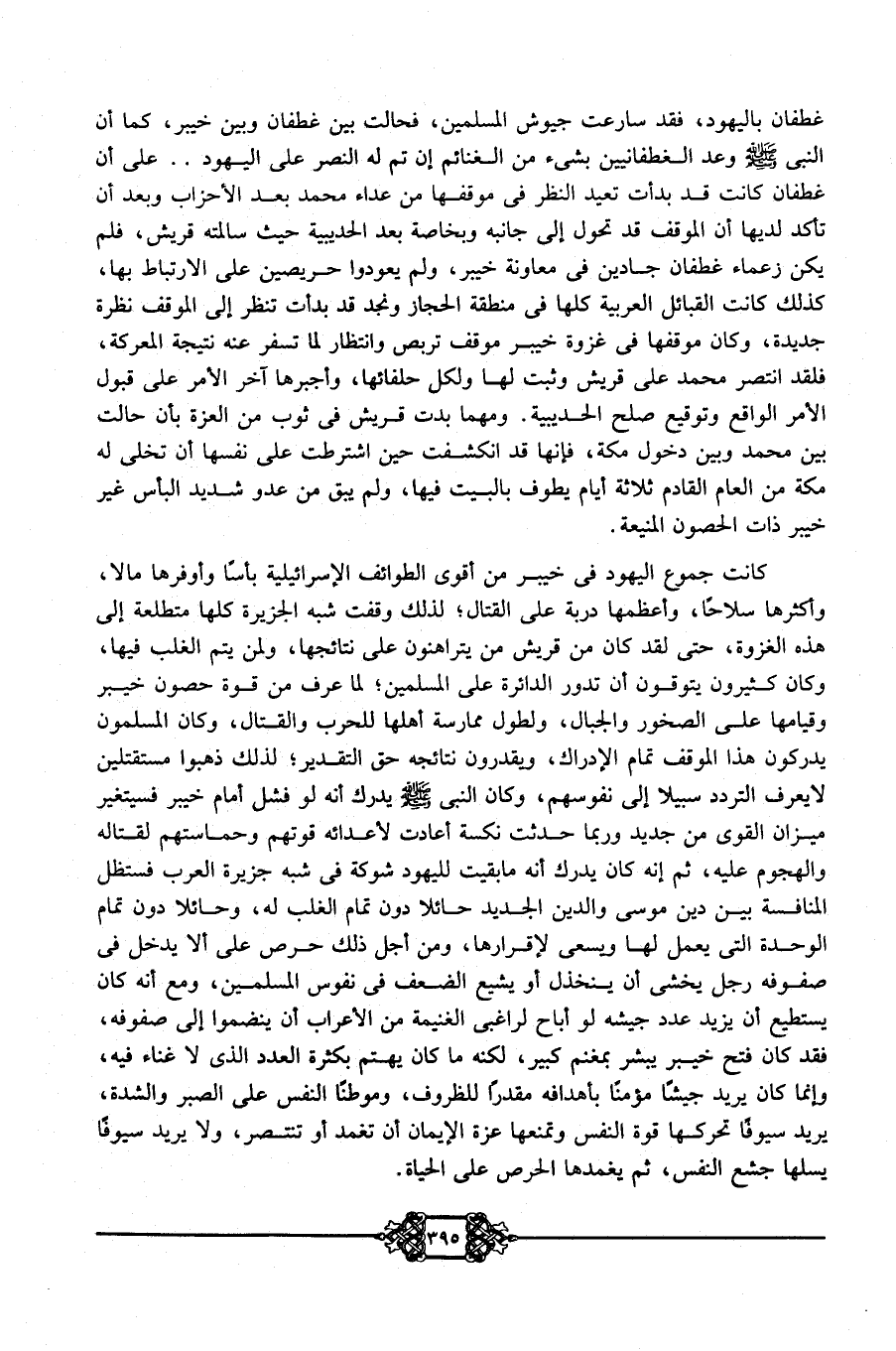 غطفان باليهود، فقد سارعت جيوش المسلمين، فحالت بين غطفان وبين خيبر، كما أن النبي -صلى الله عليه وسلم- وعد الغطفانيين بشيء من الغنائم إن تم له النصر على اليهود. على أن غطفان كانت قد بدأت تعيد النظر في موقفها من عداء محمد بعد الأحزاب، وبعد أن تأكد لديها أن الموقف قد تحول إلى جانبه وبخاصة بعد الحديبية حيث سالمته قريش، فلم يكن زعماء غطفان جادين في معاونة خيبر، ولم يعودوا حريصين على الارتباط بها، كذلك كانت القبائل العربية كلها في منطقة الحجاز ونجد قد بدأت تنظر إلى الموقف نظرة جديدة، وكان موقفها في غزوة خيبر موقف تربص وانتظار لما تسفر عنه نتيجة المعركة، فلقد انتصر محمد على قريش وثَبَتَ لها ولكل حلفائها، وأجبرها آخر الأمر على قبول الأمر الواقع وتوقيع صلح الحديبية. ومهما بدت قريش في ثوب من العزة بأن حالت بين محمد وبين دخول مكة؛ فإنها قد انكشفت حين اشترطت على نفسها أن تخلي له مكة من العام القادم ثلاثة أيام يطوف بالبيت فيها، ولم يبق من عدو شديد البأس غير خيبر ذات الحصون المنيعة.