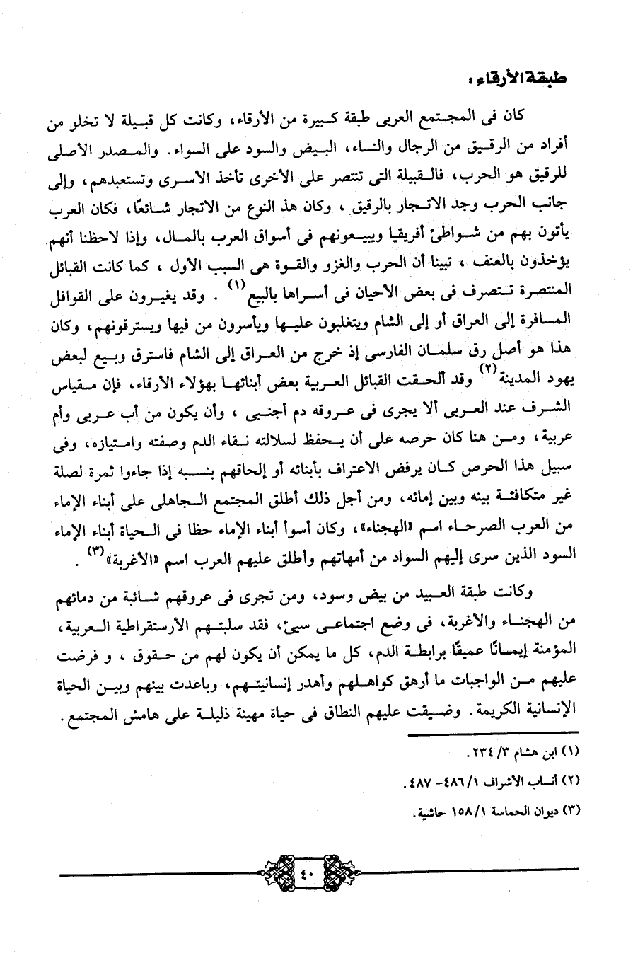 وكانت طبقة العبيد من بيض وسود، ومن تجري في عروقهم شائبة من دمائهم من الهجناء والأغربة، في وضع اجتماعي سيئ، فقد سلبتهم الأرستقراطية العربية، المؤمنة إيمانًا عميقًا برابطة الدم، كل ما يمكن أن يكون لهم من حقوق، وفرضت عليهم من الواجبات ما أرهق كواهلهم وأهدر إنسانيتهم، وباعدت بينهم وبين الحياة الإنسانية الكريمة. وضيقت عليهم النطاق في حياة مهينة ذليلة على هامش المجتمع.