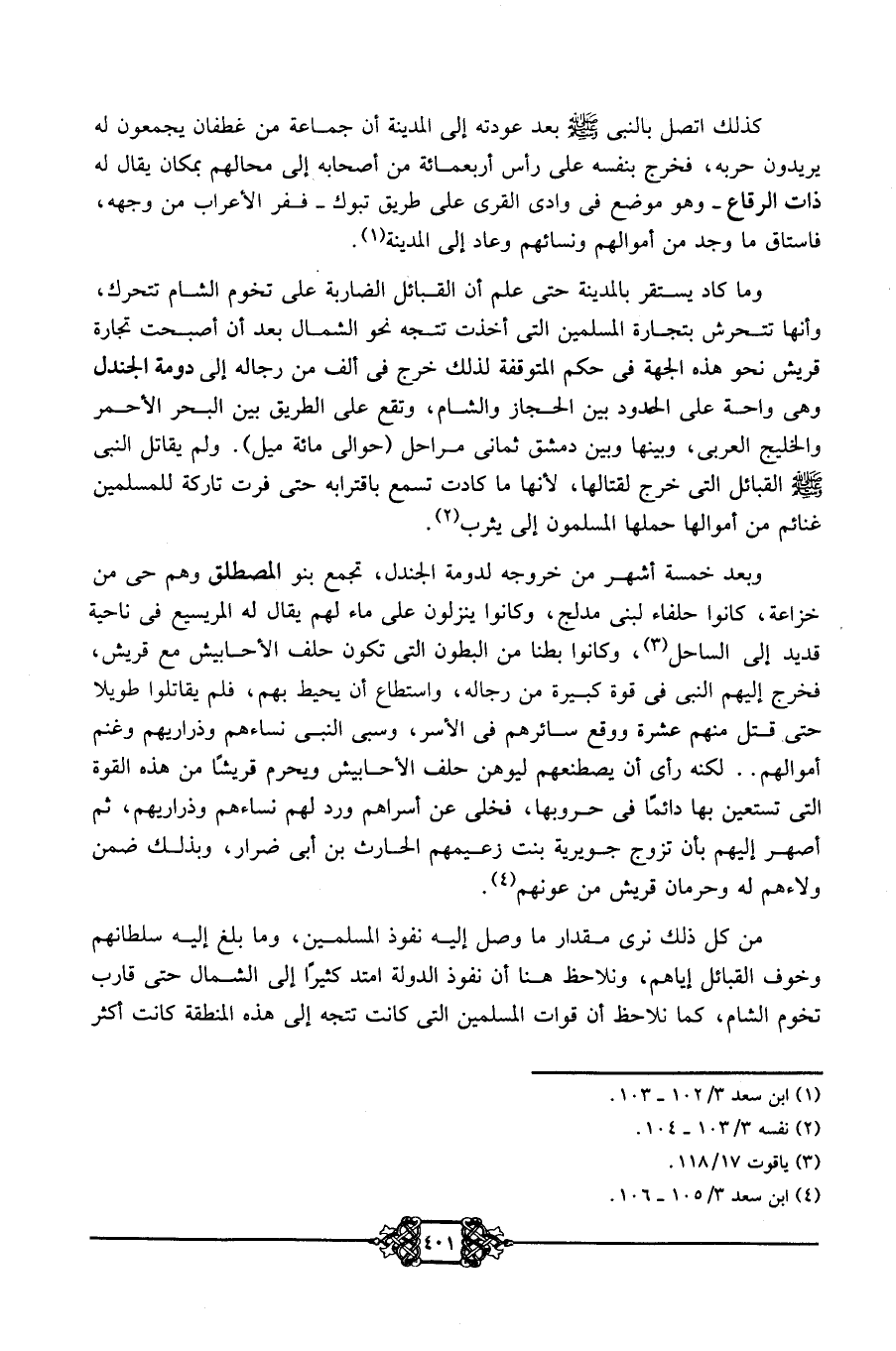 وما كاد يستقر بالمدينة حتى علم أن القبائل الضاربة على تخوم الشام، تتحرك وأنها تتحرش بتجارة المسلمين التي أخذت تتجه نحو الشمال بعد أن أصبحت تجارة قريش نحو هذه الجهة في حكم المتوقفة؛ لذلك خرج في ألف من رجاله إلى دومة الجندل وهي واحة على الحدود بين الحجاز والشام، وتقع على الطريق بين البحر الأحمر والخليج العربي، وبينها وبين دمشق ثماني مراحل -حوالي مائة ميل- ولم يقاتل النبي -صلى الله عليه وسلم- القبائل التي خرج لقتالها؛ لأنها ما كادت تسمع باقترابه حتى فرت تاركة للمسلمين غنائم من أموالها حملها المسلمون إلى يثرب2.