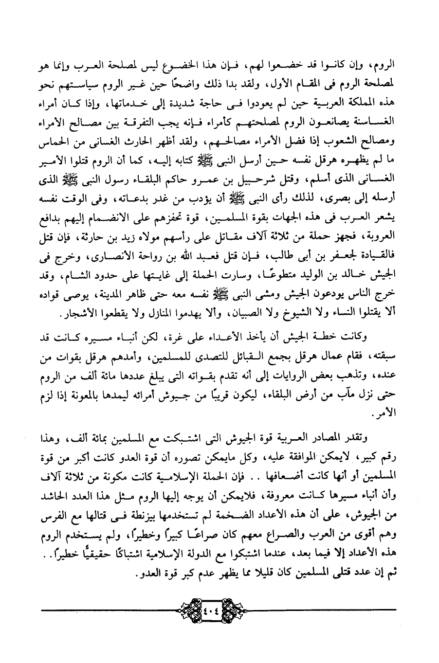 الروم، وإن كانوا قد خضعوا لهم؛ فإن هذا الخضوع ليس لمصلحة العرب وإنما هو لمصلحة الروم في المقام الأول، ولقد بدا ذلك واضحًا حين غير الروم سياستهم نحو هذه المملكة العربية حين لم يعودوا في حاجة شديدة إلى خدماتها، وإذا كان أمراء الغساسنة يصانعون الروم لمصلحتهم كأمراء فإنه يجب التفرقة بين مصالح الأمراء ومصالح الشعوب إذا فضل الأمراء مصالحهم، ولقد أظهر الحارث الغساني من الحماس ما لم يظهره هرقل نفسه حين أرسل النبي -صلى الله عليه وسلم- كتابه إليه، كما أن الروم قتلوا الأمير الغساني الذي أسلم، وقتل شرحبيل بن عمرو حاكم البلقاء رسول النبي -صلى الله عليه وسلم- الذي أرسله إلى بصرى؛ لذلك رأى النبي -صلى الله عليه وسلم أن يؤدب من غدر بدعاته، وفي الوقت نفسه يشعر العرب في هذه الجهات بقوة المسلمين، قوة تحفزهم على الانضمام إليهم بدافع العروبة، فجهز حملة من ثلاثة آلاف مقاتل على رأسهم مولاه زيد بن حارثة، فإن قتل فالقيادة لجعفر بن أبي طالب، فإن قتل فعبد الله بن رواحة الأنصاري، وخرج في الجيش خالد بن الوليد متطوعًا، وسارت الحملة إلى غايتها على حدود الشام، وقد خرج الناس يودعون الجيش ومشى النبي -صلى الله عليه وسلم- نفسه معه حتى ظاهر المدينة، يوصي قواده ألا يقتلوا النساء ولا الشيوخ ولا الصبيان، وألا يهدموا المنازل ولا يقطعوا الأشجار.
