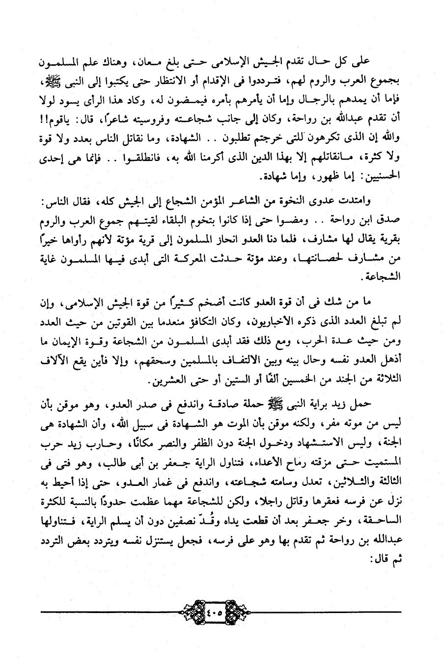 على كل حال تقدم الجيش الإسلامي حتى بلغ معان، وهناك علم المسلمون بجموع العرب والروم لهم، فترددوا في الإقدام أو الانتظار حتى يكتبوا إلى النبي -صلى الله عليه وسلم- فإما أن يمدهم بالرجال وإما أن يأمرهم بأمره فيمضون له، وكاد هذا الرأي يسود لولا أن تقدم عبد الله بن رواحة، وكان إلى جانب شجاعته وفروسيته شاعرًا، قال: يا قوم!! والله إن الذي تكرهون للتي خرجتم تطلبون، الشهادة، وما نقاتل بعدد ولا قوة ولا كثرة ما نقاتلهم إلا بهذا الدين الذي أكرمنا الله به، فانطلقوا، فإنما هي إحدى الحسنيين: إما ظهور، وإما شهادة.