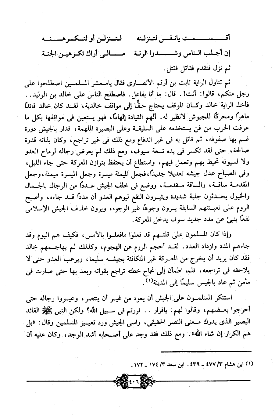 ثم تناول الراية ثابت بن أرقم الأنصاري فقال: يا معشر المسلمين اصطلحوا على رجل منكم، قالوا: أنت! قال: ما أنا بفاعل. فاصطلح الناس على خالد بن الوليد فأخذ الراية خالد، وكان الموقف يحتاج حقًّا إلى مواقف خالدية، لقد كان خالد قائدًا ماهرًا ومحركًا للجيوش لا نظيير له. أُلْهِم القيادة إلهامًا، فهو يستعين في مواقفها بكل ما عرفت الحرب من فن يستخدمه على السليقة وعلى البصيرة الملهمة فدار بالجيش دورة، ضم بها صفوفه، ثم قاتل به في غير اندفاع ومع ذلك في غير تراجع، وكان بذاته قدوة صالحة حتى لقد تكسر في يده تسعة سيوف، ومع ذلك لم يعرض رجاله لرماح العدو ولا لسيوفه تحيط بهم وتعمل فيهم، واستطاع أن يحتفظ بتوازن المعركة حتى جاء الليل، وفي الصباح عدَّل جيشه تعديلًا جديدًا، فجعل الميمنة ميسرة وجعل الميسرة ميمنة، وجعل المقدمة ساقة، والساقة مقدمة، ووضع في خلف الجيش عددًا من الرجال بالجمال والخيول يحدثون جلبة شديدة ويثيرون النقع ليوهم العدو أن مددًا قد جاءه، وأصبح الروم على تعبئتهم السابقة يرون وجوهًا غير الوجوه، ويرون خلف الجيش الإسلامي نفعًا ينبئ عن مدد جديد سوف يدخل المعركة.