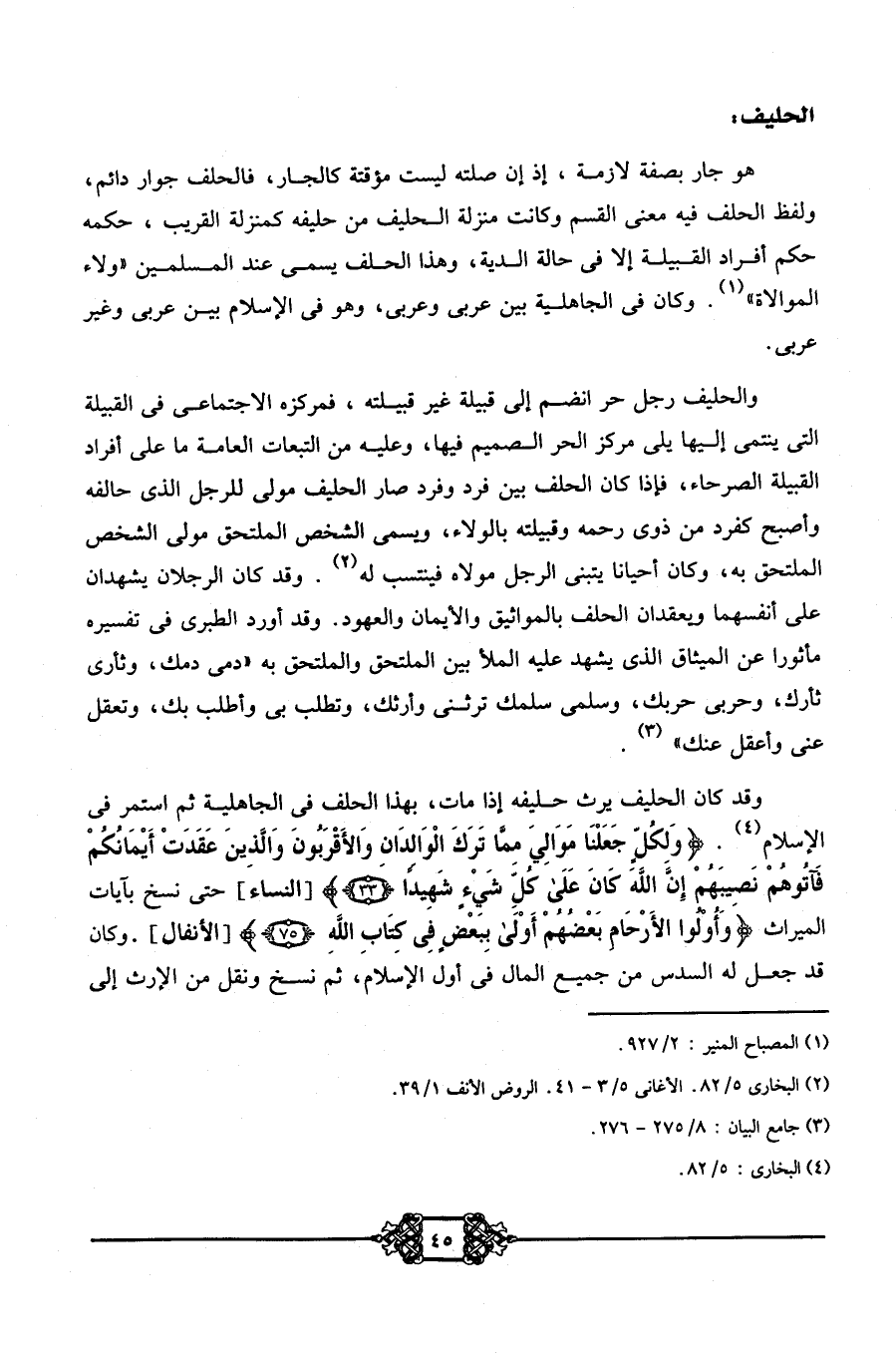 وقد كان الحليف يرث حليفه إذا مات، بهذا الحلف في الجاهلية ثم استمر في الإسلام4. {وَلِكُلٍّ جَعَلْنَا مَوَالِيَ مِمَّا تَرَكَ الْوَالِدَانِ وَالأَقْرَبُونَ وَالَّذِينَ عَقَدَتْ أَيْمَانُكُمْ فَآتُوهُمْ نَصِيبَهُمْ إِنَّ اللَّهَ كَانَ عَلَى كُلِّ شَيْءٍ شَهِيدًا} [النساء] حتى نسخ بآيات الميراث {وَأُوْلُوا الأَرْحَامِ بَعْضُهُمْ أَوْلَى بِبَعْضٍ فِي كِتَابِ اللَّهِ} [الأنفال] . وكان قد جعل له السدس من جميع المال في أول الإسلام، ثم نسخ ونقل من الإرث إلى