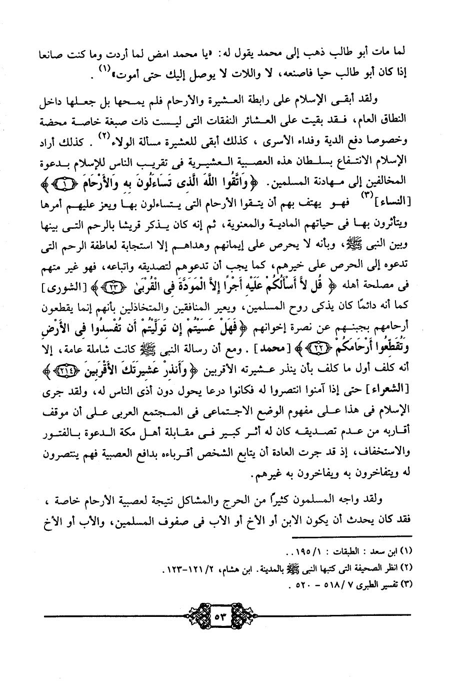 ولقد أبقى الإسلام على رابطة العشيرة والأرحام فلم يمحُها بل جعلها داخل النطاق العام، فقد بقيت على العشائر النفقات التي ليست ذات صبغة خاصة محضة وخصوصًا دفع الدية وفداء الأسرى، كذلك أبقى للعشيرة مسألة الولاء2. كذلك أراد الإسلام الانتفاع بسلطان هذه العصبية العشيرية في تقريب الناس للإسلام بدعوة المخالفين إلى مهادنة المسلمين. {وَاتَّقُوا اللَّهَ الَّذِي تَسَاءَلُونَ بِهِ وَالأَرْحَامَ} [النساء] 3 فهو يهتف بهم أن يتقوا الأرحام التي يتساءلون بها ويعز عليهم أمرها ويتأثرون بها في حياتهم المادية والمعنوية، ثم إنه كان يذكر قريشًا بالرحم التي بينها وبين النبي -صلى الله عليه وسلم- وبأنه لا يحرص على إيمانهم وهداهم إلا استجابة لعاطفة الرحم التي تدعوه إلى الحرص على خيرهم، كما يجب أن تدعوهم لتصديقه واتباعه، فهو غير متهم في مصلحة أهله {قُلْ لا أَسْأَلُكُمْ عَلَيْهِ أَجْرًا إِلاَّ الْمَوَدَّةَ فِي الْقُرْبَى} [الشورى] كما أنه دائمًا كان يذكي روح المسلمين، ويعير المنافقين والمتخاذلين بأنهم إنما يقطعون أرحامهم بجبنهم عن نصرة إخوانهم {فَهَلْ عَسَيْتُمْ إِنْ تَوَلَّيْتُمْ أَنْ تُفْسِدُوا فِي الأَرْضِ وَتُقَطِّعُوا أَرْحَامَكُمْ} [محمد] . ومع أن رسالة النبي -صلى الله عليه وسلم- كانت شاملة عامة، إلا أنه كلف أول ما كلف بأن ينذر عشيرته الأقربين {وَأَنذِرْ عَشِيرَتَكَ الأَقْرَبِين} [الشعراء] حتى إذا آمنوا انتصروا له فكانوا درعًا يحول دون أذَى الناس له، ولقد جرى الإسلام في هذا على مفهوم الوضع الاجتماعي في المجتمع العربي على أن موقف أقاربه من عدم تصديقه كان له أثر كبير في مقابلة أهل مكة الدعوة بالفتور والاستخفاف، إذ قد جرت العادة أن يتابع الشخص أقرباءه بدافع العصبية فهم ينتصرون له ويتفاخرون به ويفاخرون به غيرهم.