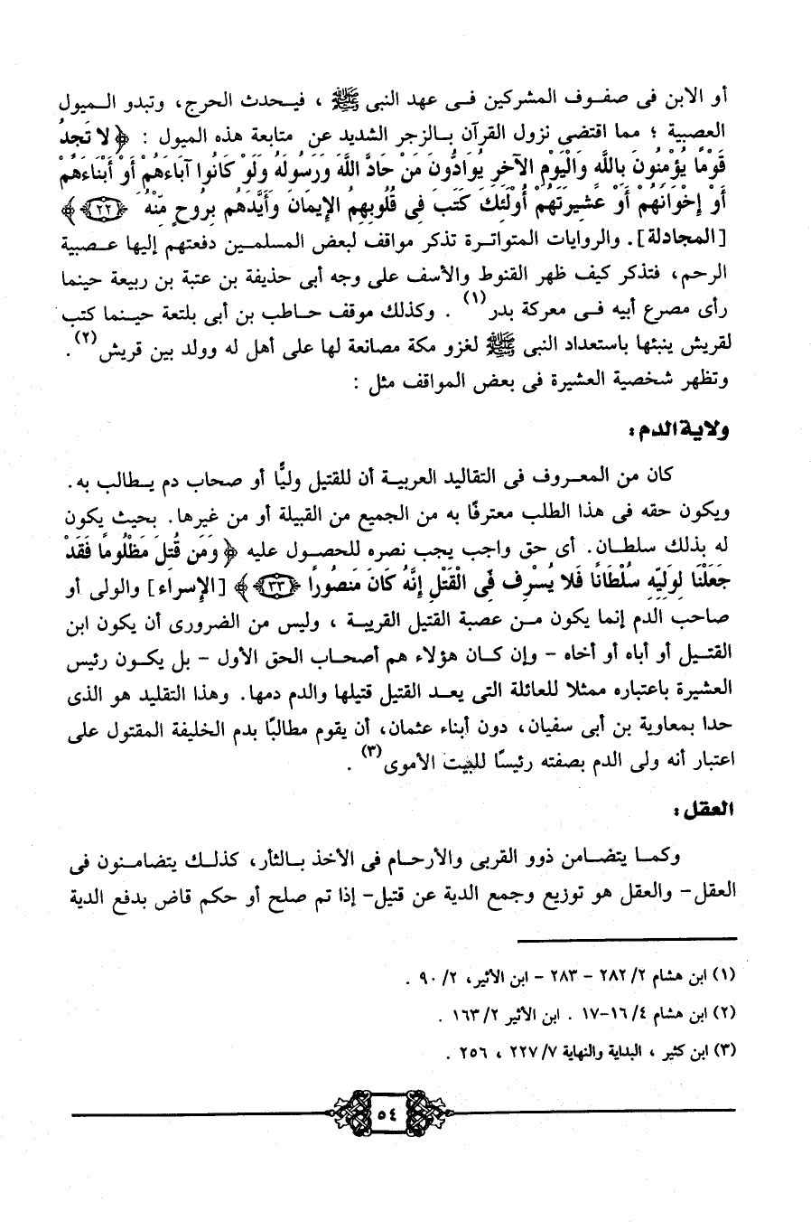 كان من المعروف في التقاليد العربية أن للقتيل وليًّا أو صاحب دم يطالب به. ويكون حقه في هذا الطلب معترفًا به من الجميع من القبيلة أو من غيرها. بحيث يكون له بذلك سلطان. أي حق واجب يجب نصره للحصول عليه {وَمَنْ قُتِلَ مَظْلُومًا فَقَدْ جَعَلْنَا لِوَلِيِّهِ سُلْطَانًا فَلا يُسْرِفْ فِي الْقَتْلِ إِنَّهُ كَانَ مَنصُورًا} [الإسراء] والولي أو صاحب الدم إنما يكون من عصبة القتيل القريبة، ليس من الضروري أن يكون ابن القتيل أو أباه أو أخاه- وإن كان هؤلاء هم أصحاب الحق الأول- بل يكون رئيس العشيرة باعتباره ممثلًا للعائلة التي يعد القتيل قتيلها والدم دمها. وهذا التقليد هو الذي حدا بمعاوية بن أبي سفيان، دون أبناء عثمان، أن يقوم مطالبًا بدم الخليفة المقتول على اعتبار أنه ولي الدم بصفته رئيسًا للبيت الأموي3.