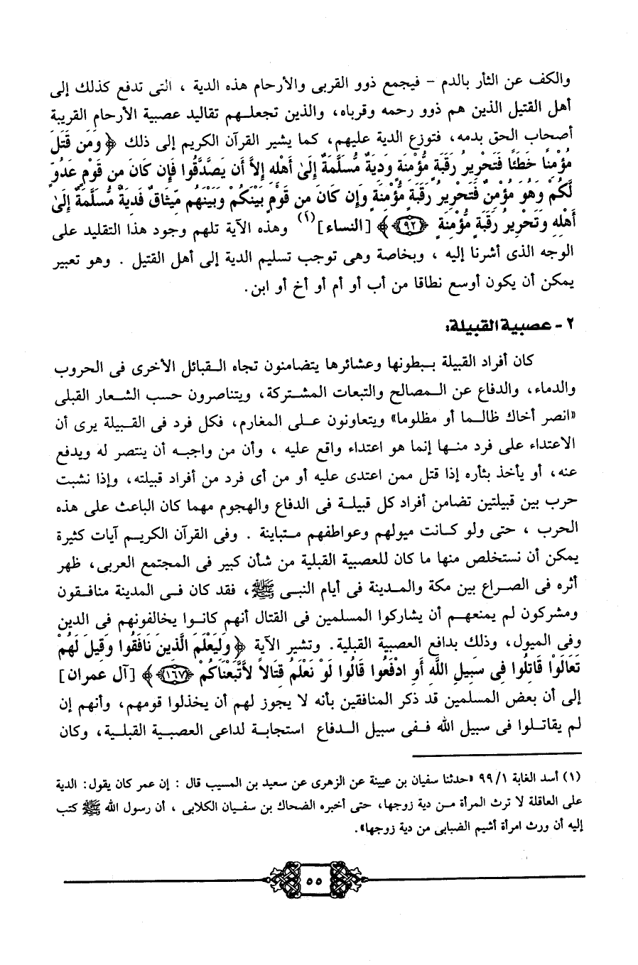 والكف عن الثأر بالدم -فيجمع ذوو القربى والأرحام هذه الدية، التي تدفع كذلك إلى أهل القتيل الذين هم ذوو رحمه وقرباه، والذين تجعلهم تقاليد عصبية الأرحام القريبة أصحاب الحق بدمه، فتوزع الدية عليهم، كما يشير القرآن الكريم إلى ذلك {وَمَنْ قَتَلَ مُؤْمِنًا خَطَأً فَتَحْرِيرُ رَقَبَةٍ مُؤْمِنَةٍ وَدِيَةٌ مُسَلَّمَةٌ إِلَى أَهْلِهِ إِلاَّ أَنْ يَصَّدَّقُوا فَإِنْ كَانَ مِنْ قَوْمٍ عَدُوٍّ لَكُمْ وَهُوَ مُؤْمِنٌ فَتَحْرِيرُ رَقَبَةٍ مُؤْمِنَةٍ وَإِنْ كَانَ مِنْ قَوْمٍ بَيْنَكُمْ وَبَيْنَهُمْ مِيثَاقٌ فَدِيَةٌ مُسَلَّمَةٌ إِلَى أَهْلِهِ وَتَحْرِيرُ رَقَبَةٍ مُؤْمِنَةٍ} [النساء] 1 وهذه الآية تلهم وجود هذا التقليد على الوجه الذي أشرنا إليه، وبخاصة وهي توجب تسليم الدية إلى أهل القتيل. وهو تعبير يمكن أن يكون أوسع نطاقًا من أب أو أم أو أخ أو ابن.