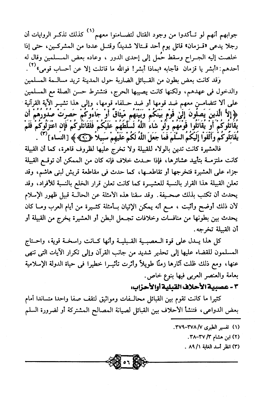 جوابهم أنهم لو تأكدوا من وجود القتال لتضامنوا معهم1 كذلك تذكر الروايات أن رجلًا يدعى "قزمان" قاتل يوم أحد قتالًا شديدًا وقتل عددًا من المشركين، حتى إذا خلصت إليه الجراح وسقط حُمل إلى أحد الدور، وعاده بعض المسلمين وقال له أحدهم: "أبشرْ يا قزمان فأجابه: بماذا أبشَّر! فوالله ما قاتلت إلا عن أحساب قومي"2.