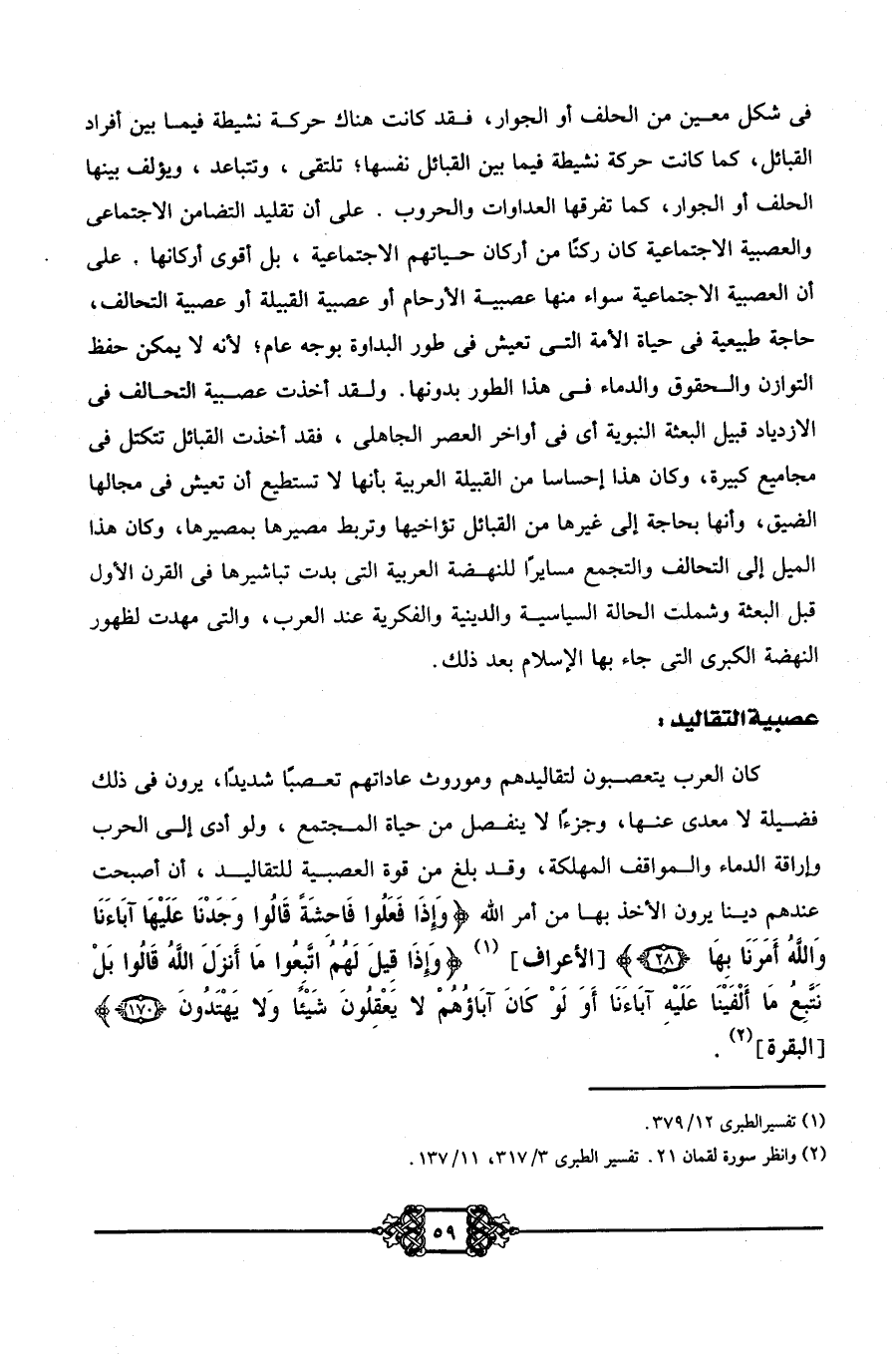 في شكل معين من الحلف أو الجوار، فقد كانت هناك حركة نشيطة فيما بين أفراد القبائل، كما كانت حركة نشيطة فيما بين القبائل نفسها؛ تلتقي، وتتباعد، ويؤلف ببينهما الحلف أو الجوار، كما تفرقها العدوات والحروب. على أن تقليد التضامن الاجتماعي والعصبية كان ركنًا من أركان حياتهم الاجتماعية، بل أقوى أركانها. على أن العصبية الاجتماعية سواء منها عصبية الأرحام أو عصبية القبلية أو عصبية التحالف، حاجة طبيعية في حياة الأمة التي تعيش في طور البداوة بوجه عام؛ لأنه لا يمكن حفظ التوازن والحقوق والدماء في هذا الطور بدونها. ولقد أخذت عصبية التحالف في الازدياد قبيل البعثة النبوية أي في أواخر العصر الجاهلي، فقد أخذت القبائل تتكتل في مجاميعَ كبيرةٍ، وكان هذا إحساسًا من القبيلة العربية بأنها لا تستطيع أن تعيش في مجالها الضيق، وأنها بحاجة إلى غيرها من القبائل التي تؤاخيها وتربط مصيرها بمصيرها، وكان هذا الميل إلى التحالف والتجمع مسايرًا للنهضة العربية التي بدت تباشيرها في القرن الأول قبل البعثة وشملت الحالة السياسية والدينية والفكرية عند العرب، والتي مهدت لظهور النهضة الكبرى التي جاء بها الإسلام بعد ذلك.