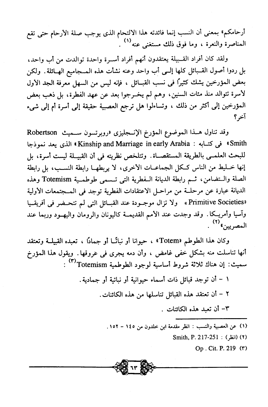 وقد تناول هذا الموضوع المؤرخ الإنجليزي "روبرتسون سميث Robertson smith في كتابه: Kinship and Marriage in early Arabia" الذي يعد نموذجًا للبحث العلمي بالطريقة المستقصاة. وتتلخص نظريته في أن القبيلة ليست أسرةً، بل إنها خليط من الناس ككل الجماعات الأخرى، لا يربطها رابطة النسب، بل رابطة الصلة والتضامن، ثم رابطة الديانة الفطرية التي تسمى طوطمية Totemism وهذه الديانة عبارة عن مرحلة من مراحل الاعتقادات الفطرية توجد في المجتمعات الأولية "Primitive societies" ولا تزال موجودة عند القبائل التي لم تتحضر في أفريقيا وآسيا وأمريكا. وقد وجدت عند الأمم القديمة كاليونان والرومان واليهود وربما عند المصريين2.