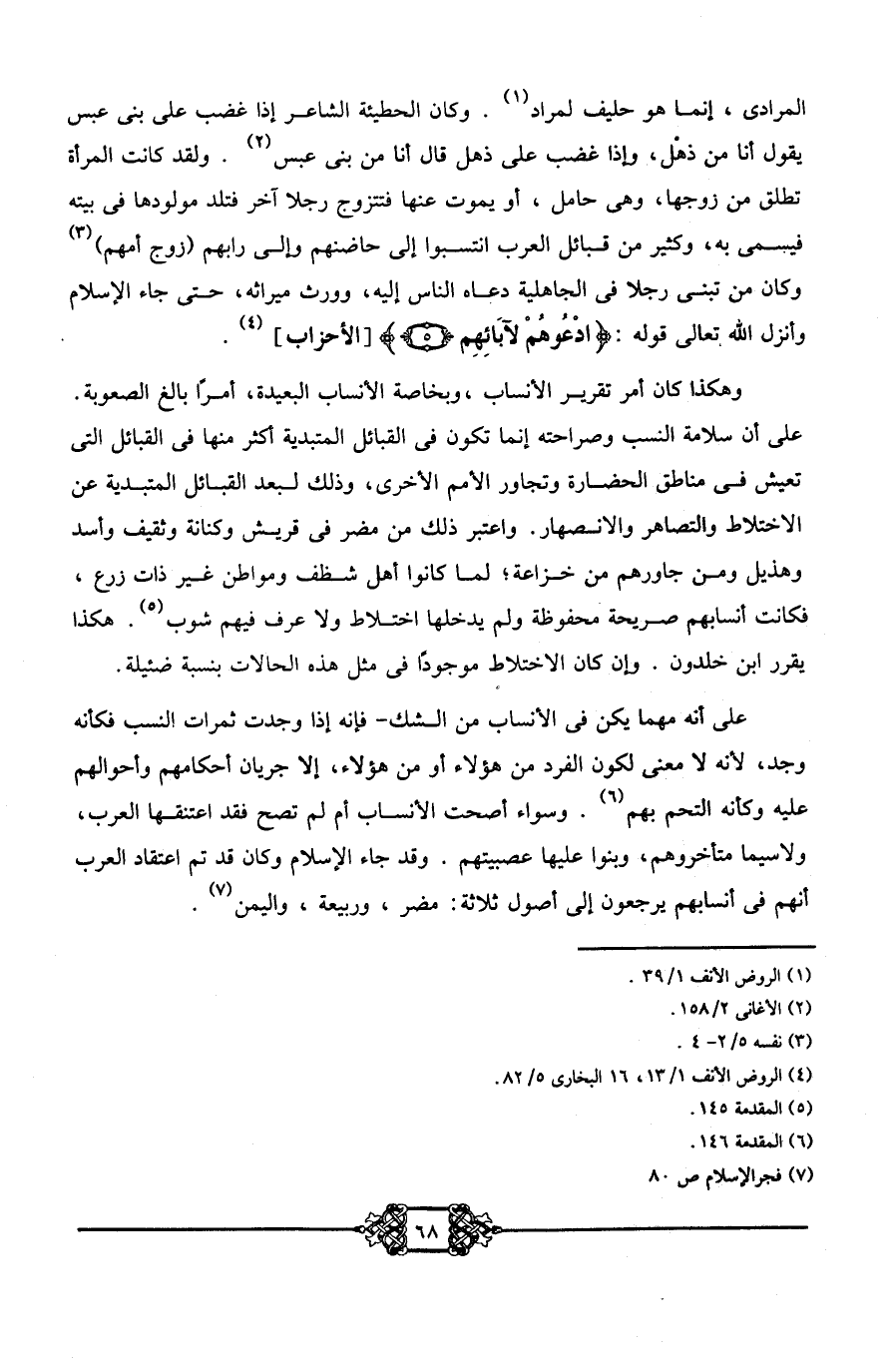 المرادي، إنما هو حليف لمراد1 وكان الحطيئة الشاعر إذا غضب على بني عبس يقول: أنا من ذهل، وإذا غضب على ذهل قال: أنا من بني عبس2. ولقد كانت المرأة تطلَّق من زوجها، وهي حامل، أو يموت عنها فتتزوّج رجلًا آخر فتلد مولودها في بيته فيسمى به، وكثير من قبائل العرب انتسبوا إلى حاضنهم وإلى رابهم "زوج أمهم"3 وكان من تبنى رجلًا في الجاهلية دعاه الناس إليه، وورث ميراثه، حتى جاء الإسلام وأنزل الله تعالى قوله: {ادْعُوهُمْ لآبَائِهِمْ} [الأحزاب] 4.
