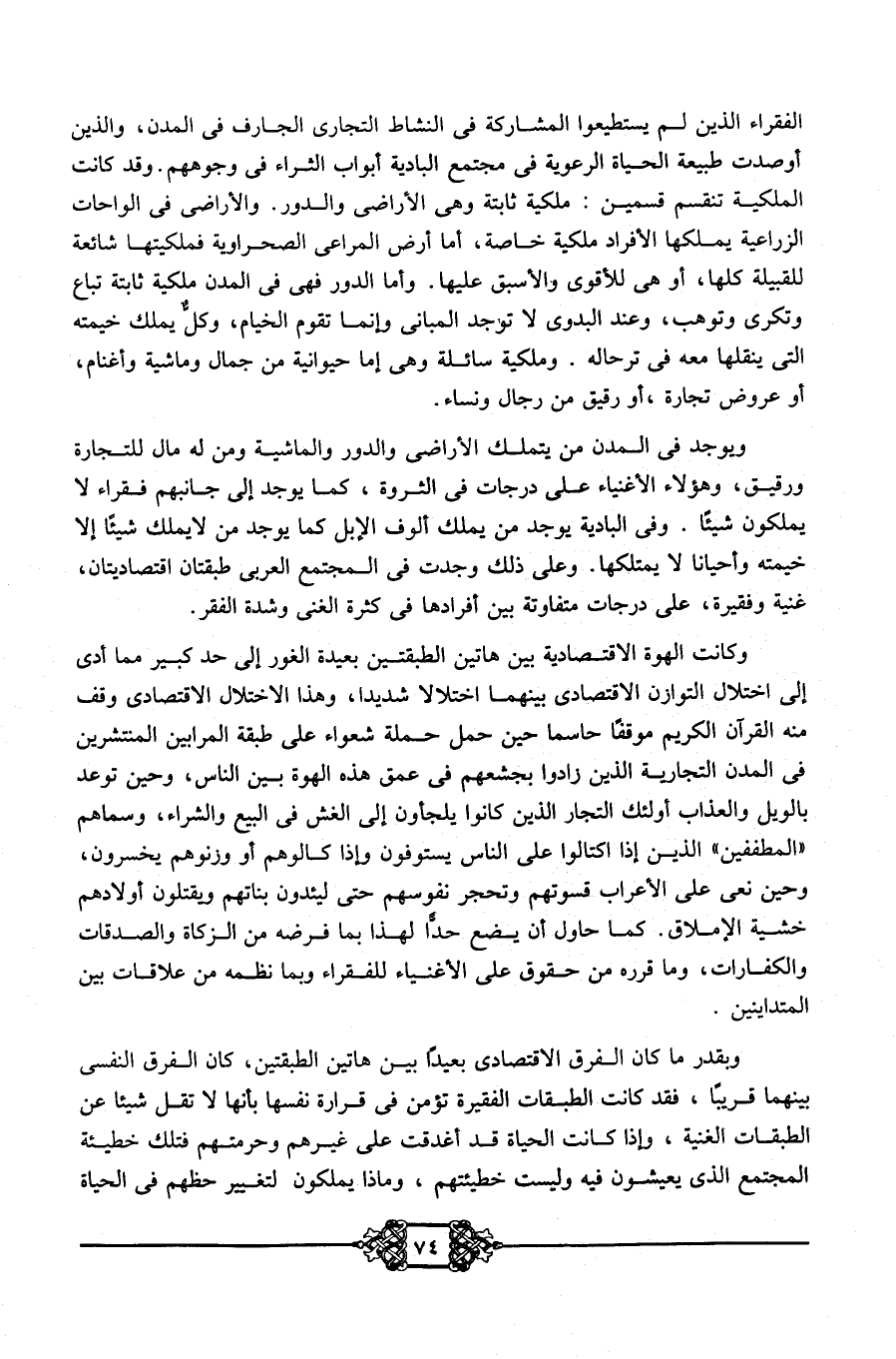وكانت الهوة الاقتصادية بين هاتين الطبقتين بعيدة الغور إلى حدّ كبير مما أدّى إلى اختلال التوازن الاقتصادي بينهما اختلالًا شديدًا، وهذا الاختلال الاقتصادي وقف منه القرآن الكريم موقفًا حاسمًا حين حمل شعواء على طبقة المرابين المنشترين في المدينة التجارية الذين زادوا بجشعهم في عمق هذه الهوّة بين الناس، وحين توعد بالويل والعذاب أولئك التجّار الذين كانوا يلجئون إلى الغش في البيع والشراء، وسماهم المطففين، الذين إذا اكتالوا على الناس يستوفون وإذا كالوهم أو وزنوهم يخسرون وحين نعي على الأعراب قسوتهم وتحجر نفوسهم حين ليئدون بناتهم ويقتلون أولادهم خشية الإملاق. كما حاول أن يضع حدًّا لهذا بما فرضه من الزكاة والصدقات والكفارات، وما قرّره من حقوق على الأغنياء للفقراء وبما نظمه من علاقات بين المتداينين.