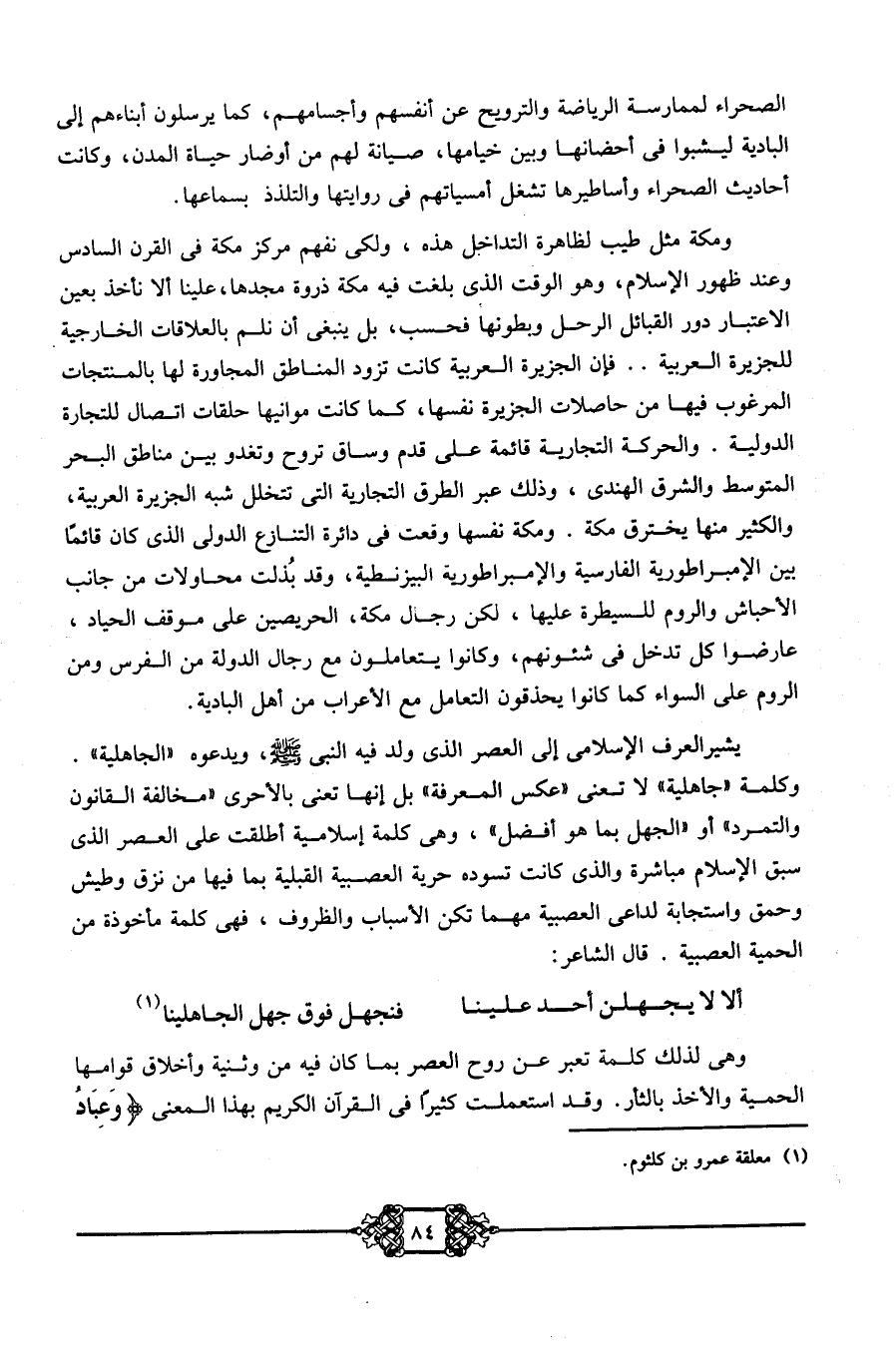 يشير العرف الإسلامي إلى العصر الذي ولد فيه النبي -صلى الله عليه سلم- ويدعوه "الجاهلية". وكلمة "جاهلية" لا تعني "عكس المعرفة"؛ بل إنها تعني بالأحرى "مخالفة القانون والتمرد" أو "الجهل بما هو أفضل" وهي كلمة إسلامية أطلقت على العصر الذي سبق الإسلام مباشرة والذي كانت تسوده حرية العصبية القبلية بما فيها من نزقٍ وطيشٍ وحمقٍ واستجابةٍ لداعي العصبية مهما تكن الأسباب والظروف، فهي كلمة مأخوذة من الحمية العصبية. قال الشاعر: