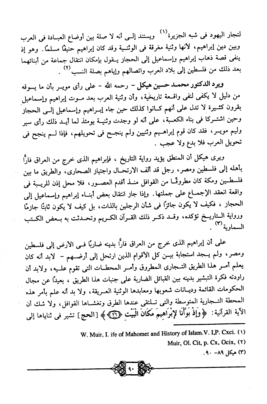 لتجّار اليهود في شبه الجزيرة1 ويستند إلى أنّه لا صلةَ بين أوضاع العبادة في العرب وبين دين إبراهيم؛ لأنها وثنيةٌ مغرقةٌ في الوثنية وقد كان إبراهيمُ حنيفًا مسلمًا. وهو إذا ينفي قصّة ذهاب إبراهيم وإسماعيل إلى الحجاز يقول بإمكان انتقال جماعة من أبنائهما بعد ذلك من فلسطين إلى بلاد العرب واتصالهم وإياهم بصلة النسب2.