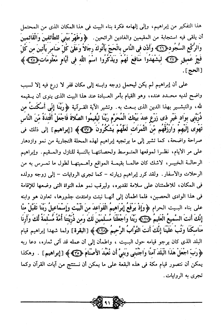 على أن إبراهيم لم يكن ليحمل زوجه وابنه إلى مكان قفر لا زرع فيه إلا لسبب واضح لديه محدد عنده، وهو القيام بأمر العبادة عند هذا البيت الذي ينوي أن يقيمه لله، والتبشير بهذا الدين الذي بعث به. وتشير الآية القرآنية: {رَبَّنَا إِنِّي أَسْكَنتُ مِنْ ذُرِّيَّتِي بِوَادٍ غَيْرِ ذِي زَرْعٍ عِنْدَ بَيْتِكَ الْمُحَرَّمِ رَبَّنَا لِيُقِيمُوا الصَّلاةَ فَاجْعَلْ أَفْئِدَةً مِنَ النَّاسِ تَهْوِي إِلَيْهِمْ وَارْزُقْهُمْ مِنَ الثَّمَرَاتِ لَعَلَّهُمْ يَشْكُرُونَ} [إبراهيم] إلى ذلك في صراحة واضحة، كما تشير إلى ما يرتجيه إبراهيم لهذه المحلة التجارية من نمو وازدهار على مرِّ الأيام؛ نظرًا لموقعها المتوسط ولحصانتها بالنسبة للنازل والمقيم وإبراهيم الرّحّالة الخبير. لا شكّ كان عالمًا بقيمة المواقع وأهميتها لطول ما تمرّس به من الرحلات والأسفار. ولقد كرّر زيارته -كما تجري الروايات- إلى زوجة وولده في المكان، للاطمئنان على سلامة تقديره، وليرقب نموّ هذه النواة التي وضعها للإقامة في هذا الوادي الحصين، فلما اطمأنّ إلى أنها نبتت وامتدّت جذورها، تعاون هو وابنه على بناء البيت الحرام {وَإِذْ يَرْفَعُ إِبْرَاهِيمُ الْقَوَاعِدَ مِنَ الْبَيْتِ وَإِسْمَاعِيلُ رَبَّنَا تَقَبَّلْ مِنَّا إِنَّكَ أَنْتَ السَّمِيعُ الْعَلِيمُ، رَبَّنَا وَاجْعَلْنَا مُسْلِمَيْنِ لَكَ وَمِنْ ذُرِّيَّتِنَا أُمَّةً مُسْلِمَةً لَكَ وَأَرِنَا مَنَاسِكَنَا وَتُبْ عَلَيْنَا إِنَّكَ أَنْتَ التَّوَّابُ الرَّحِيمُ} [البقرة] . ولما شهد إبراهيم قيام البلد الذي كان يرجو قيامَه حول البيت، واطمأنّ إلى أن عمله قد آتى ثماره، دعا ربه {رَبِّ اجْعَلْ هَذَا الْبَلَدَ آمِنًا وَاجْنُبْنِي وَبَنِيَّ أَنْ نَعْبُدَ الْأَصْنَامَ} [إبراهيم] وهكذا يمكن أن نتصوّر قيام مكةَ في هذه البقعة على ما يمكن أن نستنتج من آيات القرآن وكما تجري به الروايات.