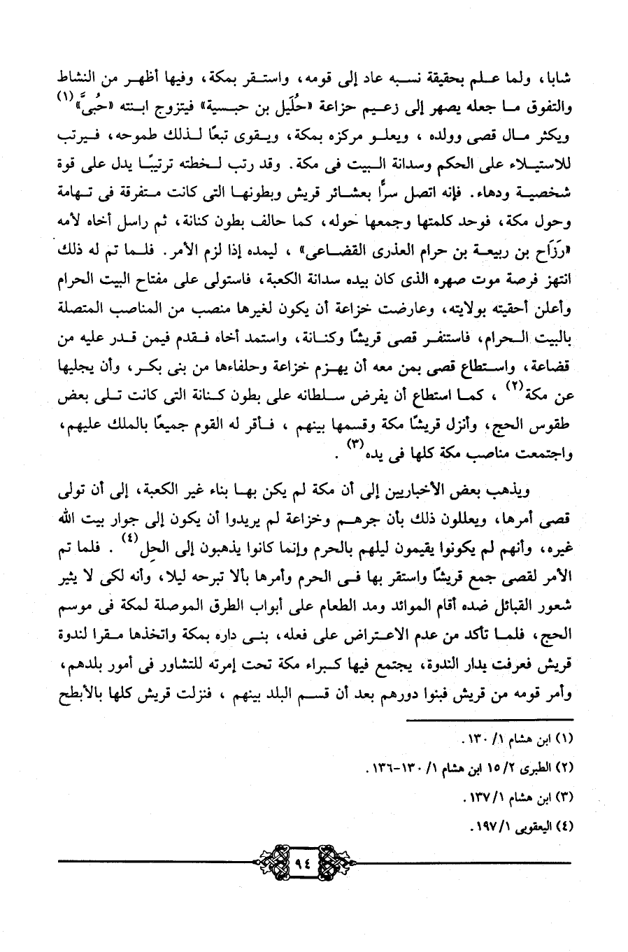 شابًّا، ولما علم بحقيقة نسبه عاد إلى قومه، واستقر بمكة، وفيها أظهر من النشاط والتفوق ما جعله يصهر إلى زعيم خزاعة: حليل بن حبشية، فيتزوج ابنته حبى1، ويكثر مال قصي وولده، ويعلو مركزه بمكة، ويقوى تبعًا لذلك طموحه، فيرتب للاستيلاء على الحكم وسدانة البيت في مكة. وقد رتب لخطته ترتيبًا يدل على قوة شخصية ودهاء. فإنه اتصل سرًّا بعشائر قريش وبطونها التي كانت متفرقة في تهامة وحول مكة، فوحد كلمتها وجمعها حوله، كما حالف بطون كنانة، ثم راسل أخاه لأمه رزاح بن ربيعة بن حرام العذري القضاعي؛ ليمده إذا لزم الأمر؛ فلما تم له ذلك انتهز فرصة موت صهره الذي كان بيده سدانة الكعبة، فاستولى على مفتاح البيت الحرام وأعلن أحقيته بولاتيه، وعارضت خزاعة أن يكون لغيرها منصب من المناصب المتصلة بالبيت الحرام، فاستنفر قصي قريشًا وكنانة، واستمد أخاه فقدم فيمن قدر عليه من قضاعة، واستطاع قصي بمن معه أن يهزم خزاعة وحلفاءها من بني بكر، وأن يجليها عن مكة2، كما استطاع أن يفرض سلطانه على بطون كنانة التي كانت تلي بعض طقوس الحج، وأنزل قريشًا مكة وقسمها بينهم، فأقر له القوم جميعًا بالملك عليهم، واجتمعت مناصب مكة كلها في يده3.