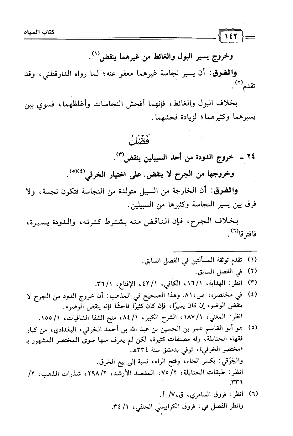 (٥) هو أبو القاسم عمر بن الحسين بن عبد الله بن أحمد الخرقي، البغدادي، من كبار فقهاء الحنابلة، وله مصنفات كثيرة، لكن لم يعرف منها سوى المختصر المشهور بـ "مختصر الخرقي"، توفي بدمشق سنة ٣٣٤ هـ.
