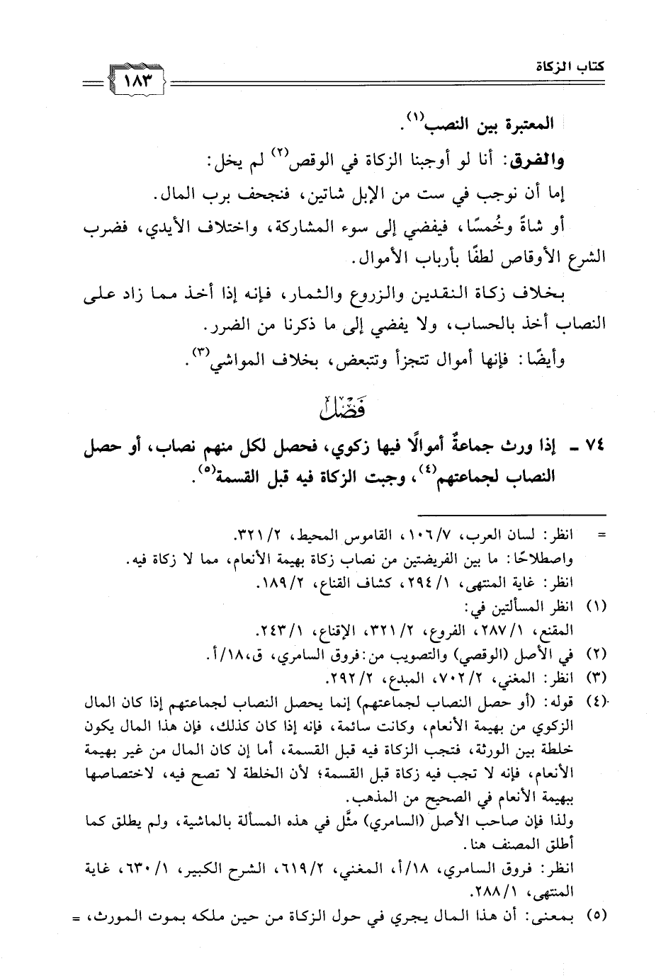 ٧٤ - إذا ورث جماعةً أموالًا فيها زكوي، فحصل لكل منهم نصاب، أو حصل النصاب لجماعتهم (٤)، وجبت الزكاة فيه قبل القسمة (٥).