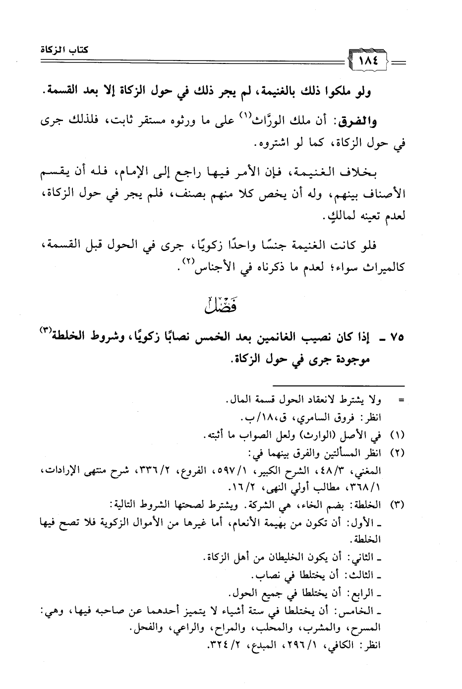 ٧٥ - إذا كان نصيب الغانمين بعد الخمس نصابًا زكويًا، وشروط الخلطة (٣) موجودة جرى في حول الزكاة.