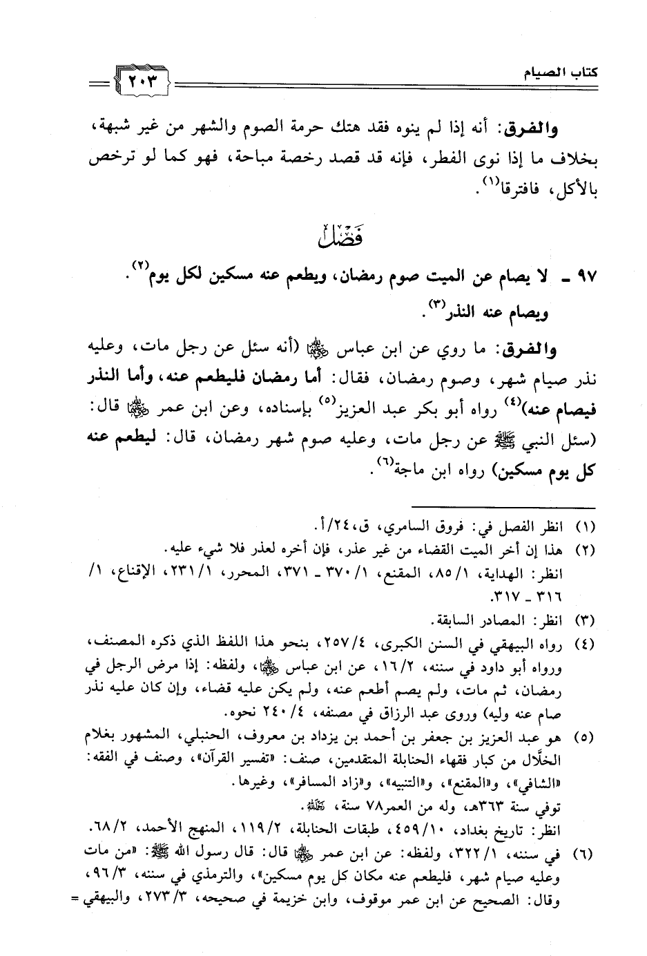 والفرق: ما روي عن ابن عباس - رضي الله عنهما - (أنَّه سئل عن رجل مات، وعليه نذر صيام شهر، وصوم رمضان، فقال: أما رمضان فليطعم عنه، وأما النذر فيصام عنه) (٤) رواه أبو بكر عبد العزيز (٥) بإسناده، وعن ابن عمر - رضي الله عنهما - قال: