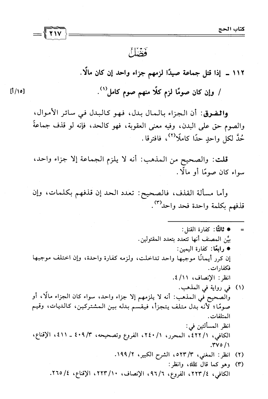 ١١٢ - إذا قتل جماعة صيدًا لزمهم جزاء واحد إن كان مالًا.