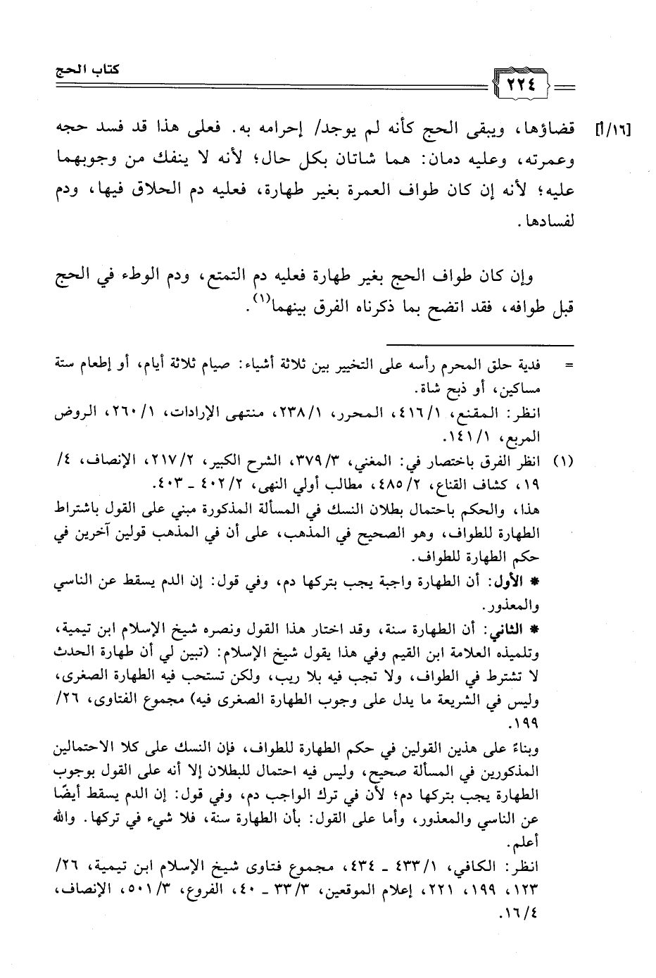 * الثاني: أن الطهارة سنة، وقد اختار هذا القول ونصره شيخ الإسلام ابن تيمية، وتلميذه العلامة ابن القيم وفي هذا يقول شيخ الإسلام: (تبين لي أن طهارة الحديث لا تشترط في الطواف، ولا تجب فيه بلا ريب، ولكن تستحب فيه الطهارة الصغرى، وليس في الشريعة ما يدل على وجوب الطهارة الصغرى فيه) مجموع الفتاوى، ٢٦/ ١٩٩.