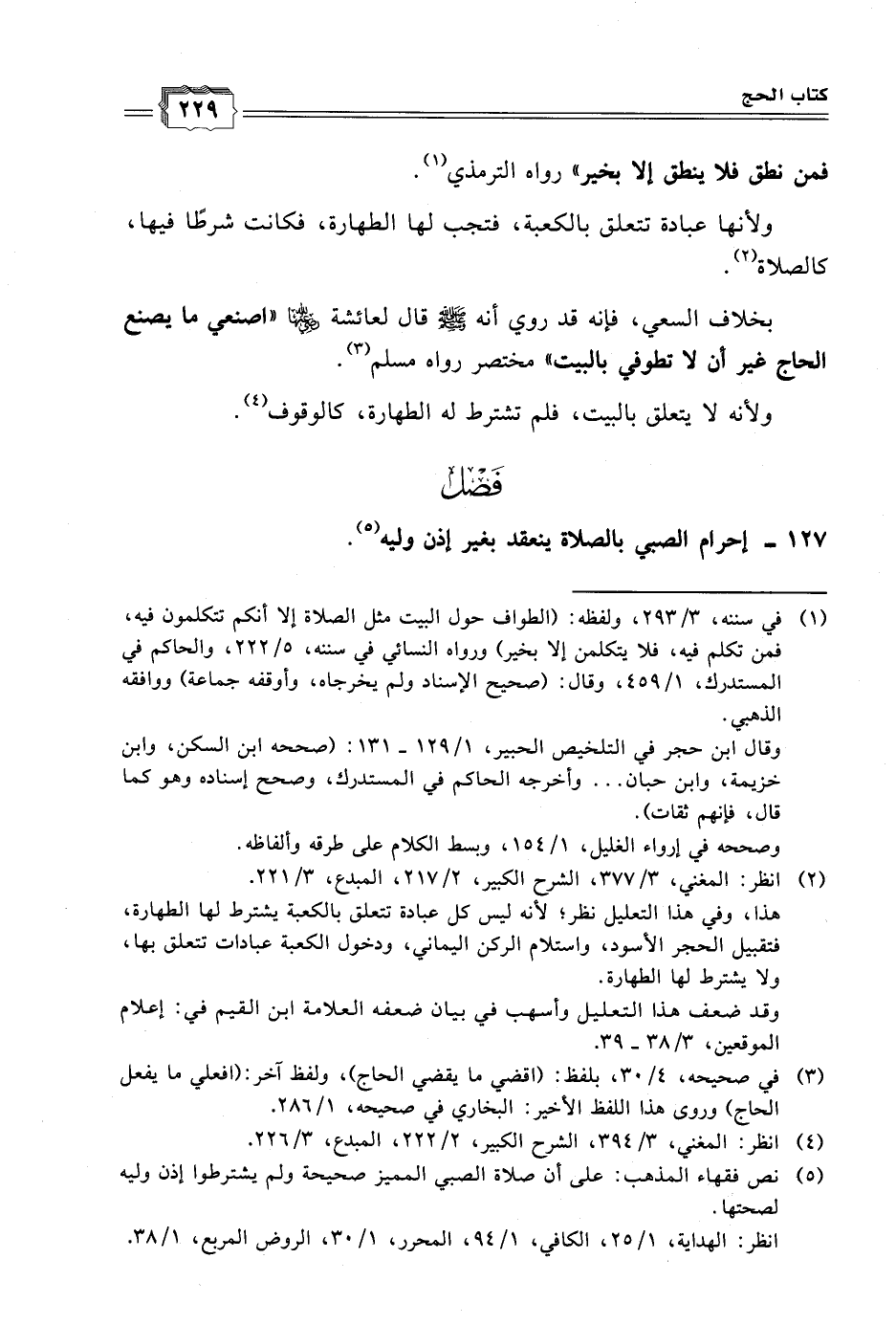 (١) في سننه، ٣/ ٢٩٣، ولفظه: (الطواف حول البيت مثل الصلاة إلا أنكم تتكلمون فيه، فمن تكلم فيه، فلا يتكلمن إلا بخير) ورواه النسائي في سننه، ٥/ ٢٢٢، والحاكم في المستدرك، ١/ ٤٥٩، وقال: (صحيح الإسناد ولم يخرجاه، وأوقفه جماعة) ووافقه الذهبي.