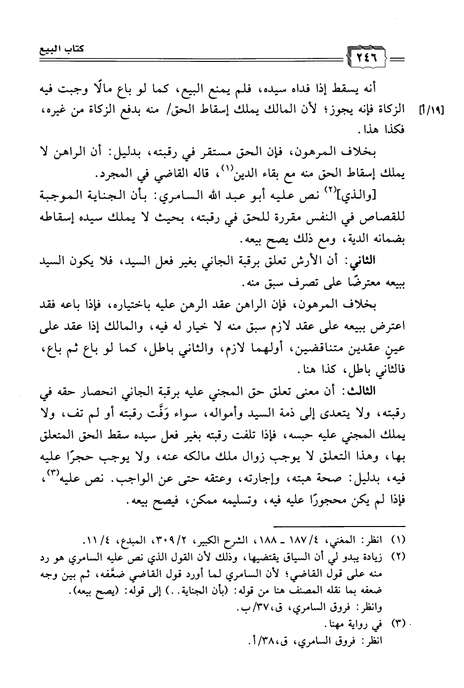 (٢) زيادة يبدو لي أن السياق يقتضيها، وذلك لأن القول الَّذي نص عليه السامري هو رد منه على قول القاضي؛ لأن السامري لما أورد قول القاضي ضعَّفه، ثم بين وجه ضعفه بما نقله المصنف هنا من قوله: (بأن الجناية ..) إلى قوله: (يصح بيعه).