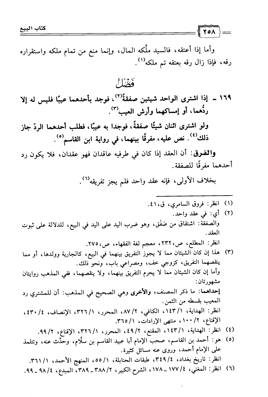 ١٦٩ - إذا اشترى الواحد شيئين صفقةً (٢)، فوجد بأحدهما عيبًا فليس له إلا ردهما، أو إمساكهما وأرش العيب (٣).