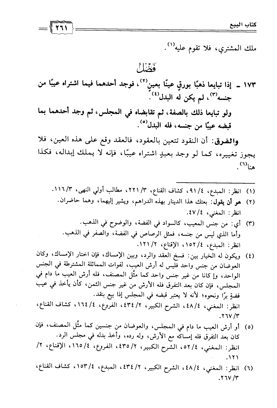 ١٧٣ - إذا تبايعا ذهبًا بورقٍ عينًا بعينٍ (٢)، فوجد أحدهما فيما اشتراه عيبًا من جنسه (٣)، لم يكن له البدل (٤).
