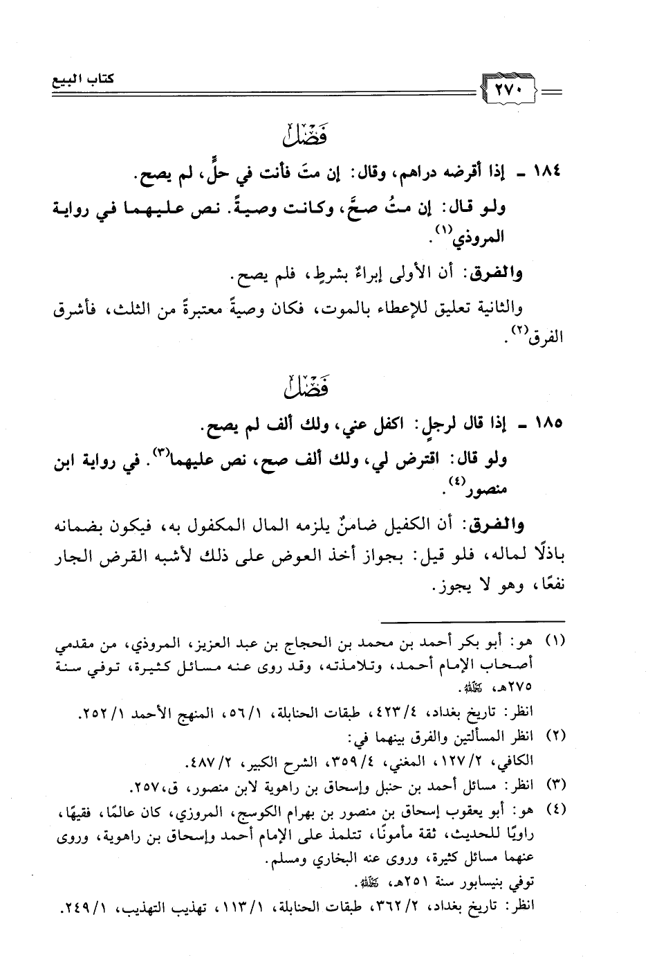 (١) هو: أبو بكر أحمد بن محمَّد بن الحجاج بن عبد العزيز، المروذي، من مقدمي أصحاب الإِمام أحمد، وتلامذته، وقد روى عنه مسائل كثيرة، توفي سنة ٢٧٥ هـ، رحمه الله.